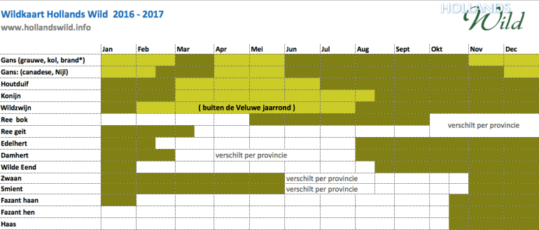 In onderstaand schema krijg je een indruk van de verkrijgbaarheid van wild. Donkergroen houdt in dat het veel beschikbaar is, lichtgroen is ook beschikbaarheid maar in iets mindere mate en wit is niet beschikbaar.