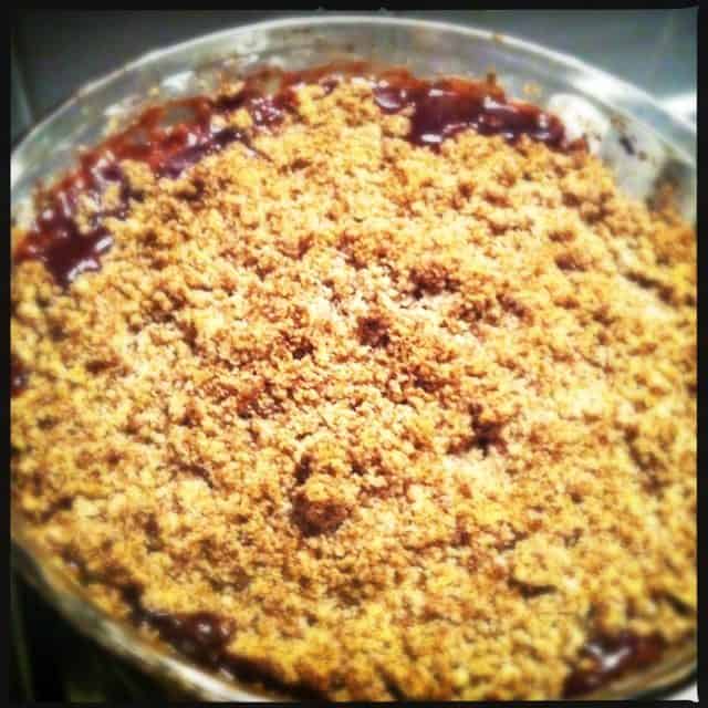 Bak de crumble zo’n 30-45 minuten in de oven totdat de crumble mooi bruin en het fruit lekker aan het borrelen is.