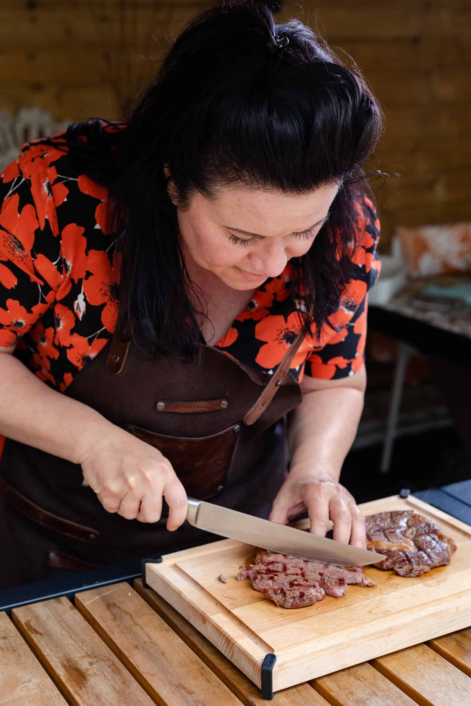 - Snijd de ribeye’s dwars op de draad (dit zijn de spiervezels en door ze tegen de draad te snijden, is het vlees malser) in dunne plakken en serveer met chimichurri (zie recept hieronder).