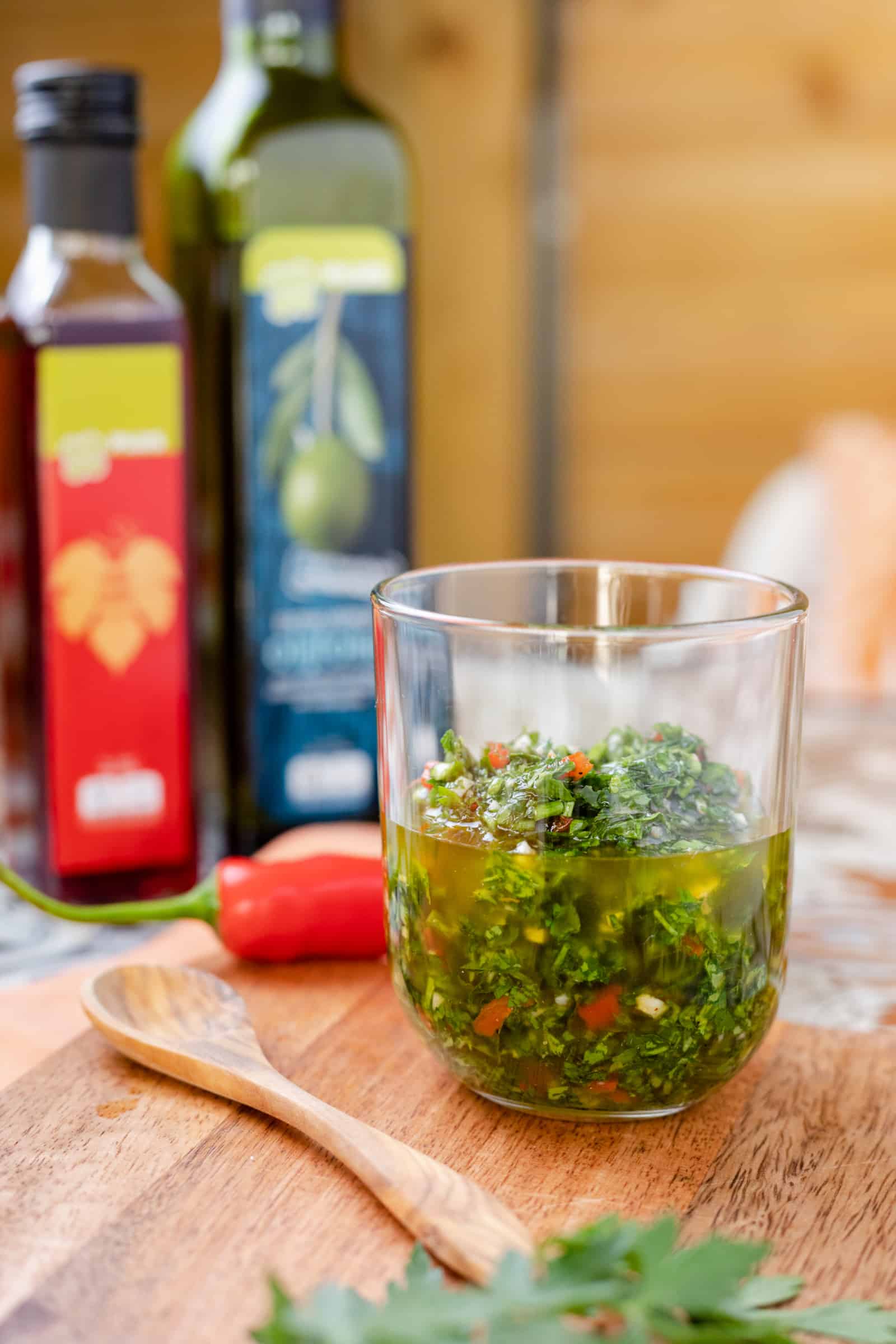 Ik gaf het in de inleiding al aan, maar een Argentijnse barbecue zonder chimichurri kan eigenlijk niet. Je kunt deze salsa al eerder op de dag bereiden en bewaren in de koelkast. Haal ‘m uit de koelkast terwijl je de barbecue aan het opstoken bent, zodat deze weer op kamertemperatuur kan komen.