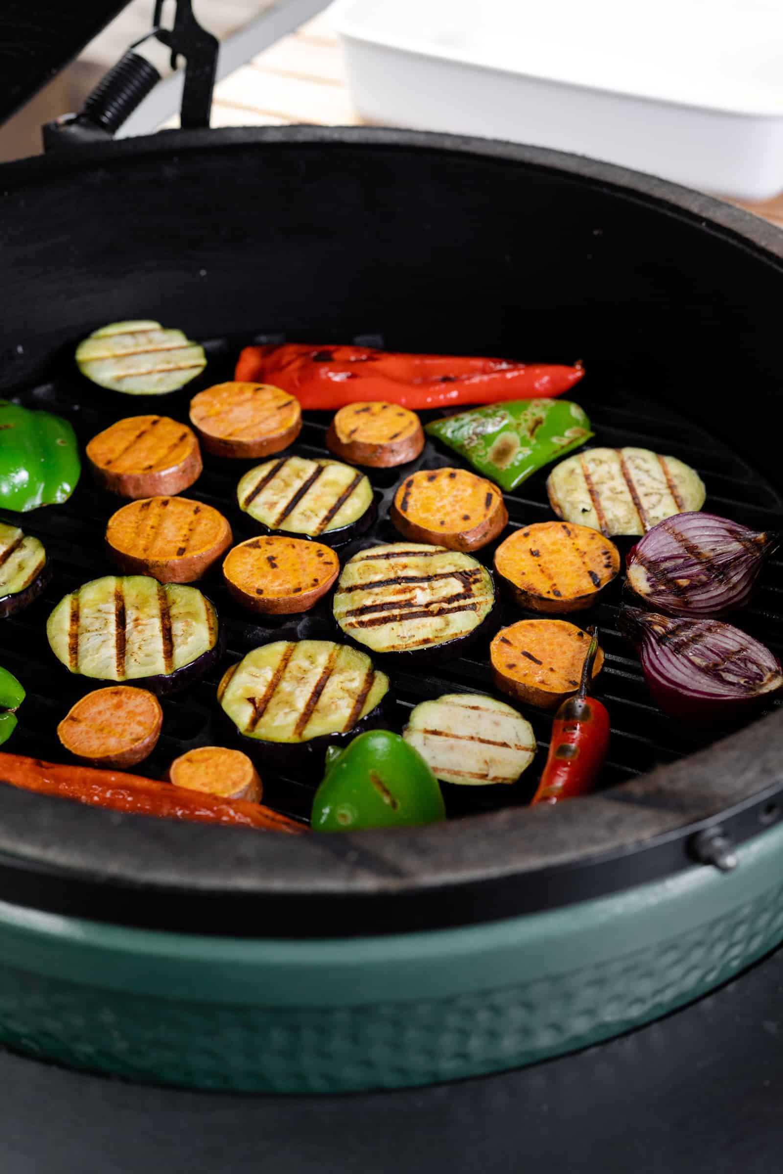 - Grill de groenten op een rooster op 180 graden (direct) tot de groenten mooie grillstrepen hebben. De paprika is als eerste klaar, daarna volgt de ui en de aubergine en de zoete aardappel heeft het langst nodig.