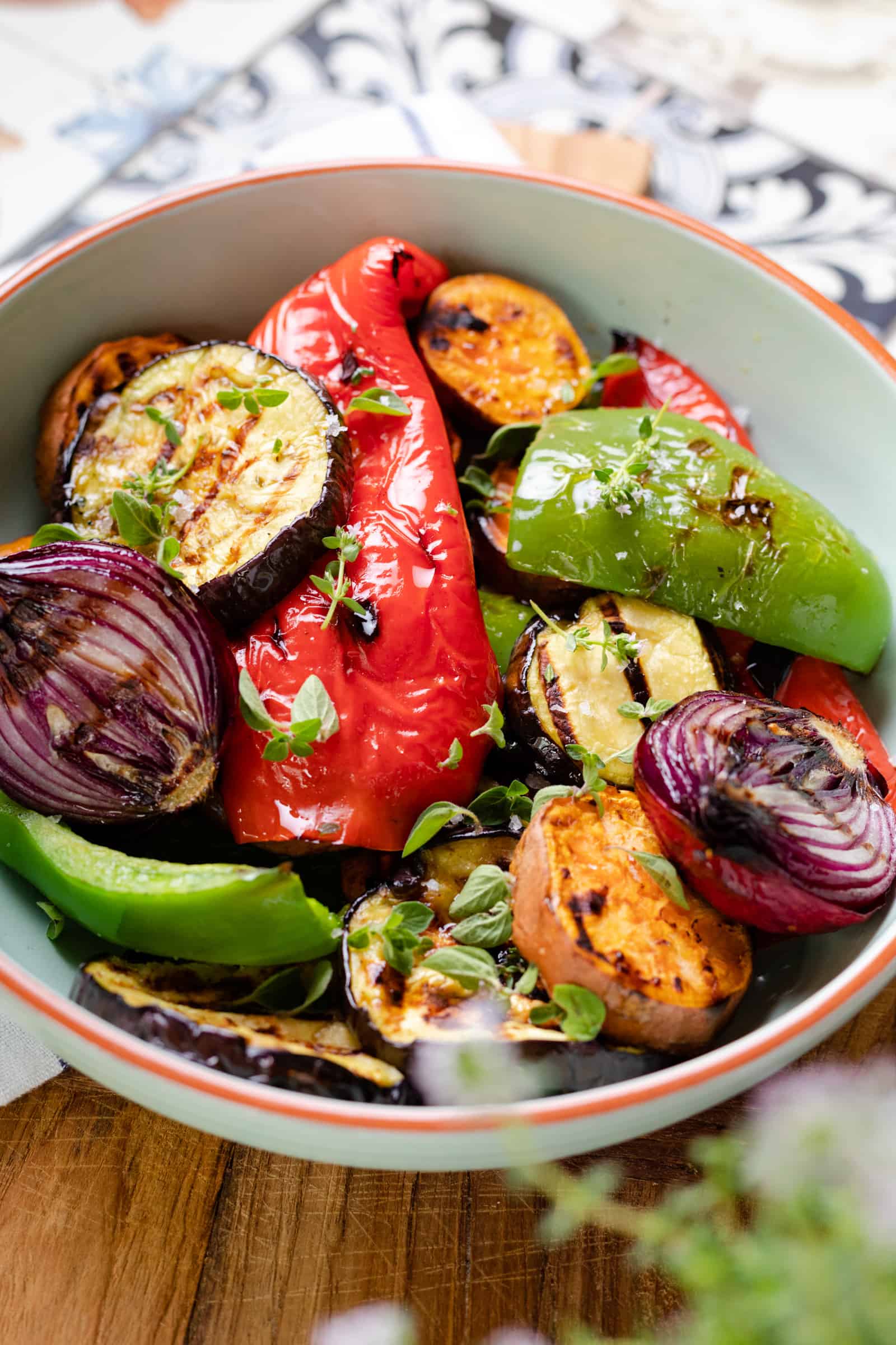 - Meng de gegrilde groenten in een schaal en houd warm. Meng vlak voor serveren met een scheut olijfolie extra vergine, eventueel nog wat grof zeezout naar smaak en een royale hoeveelheid gehakte kruiden.