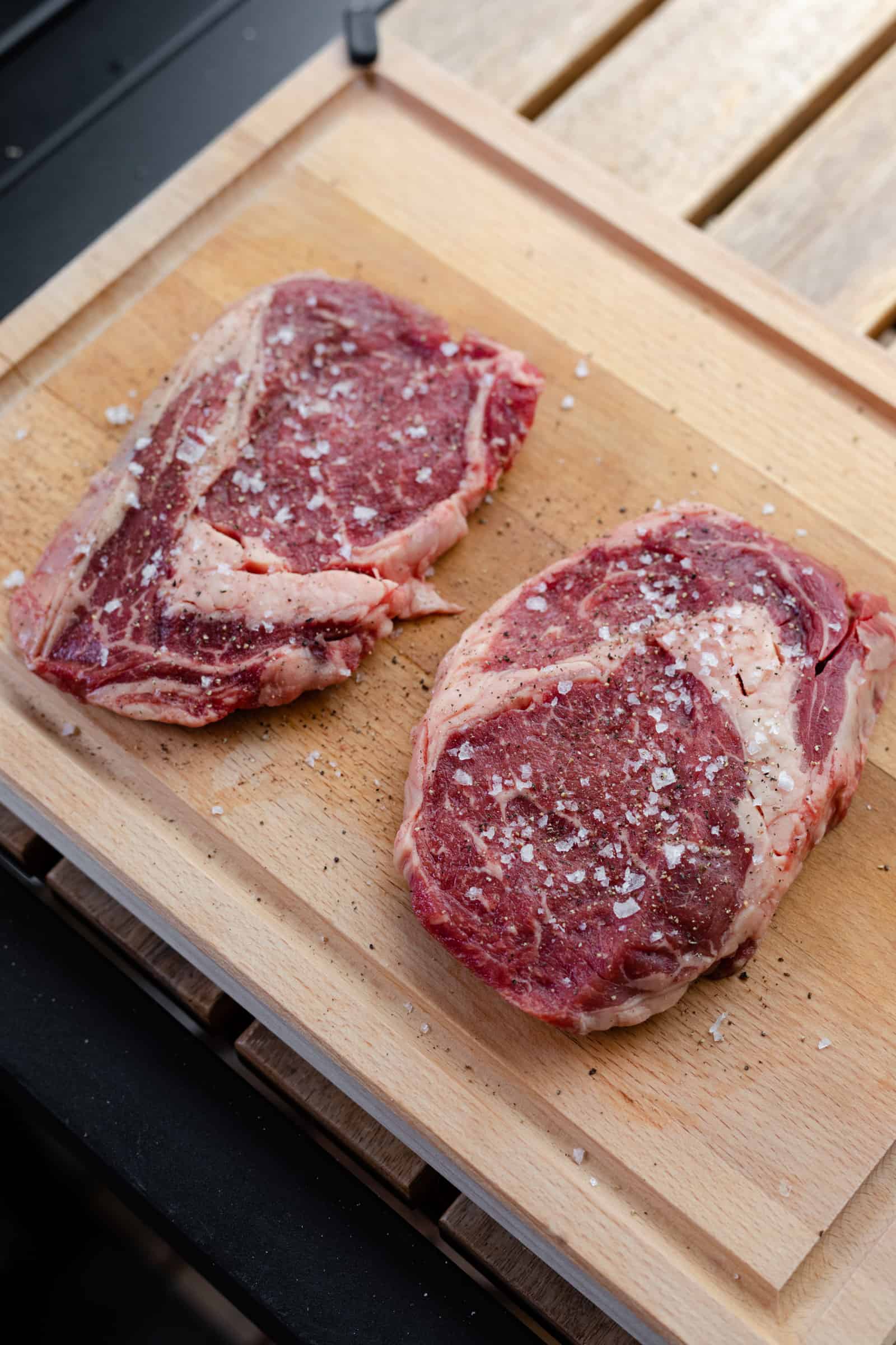 Qua ingrediënten heb je alleen maar de ribeye steaks, grof zeezout en gemalen zwarte peper nodig. En een barbecue waarmee je ook indirect kunt garen door de plaatsing van een hitteschild. De hitte van de kolen komt daardoor niet in direct contact met het vlees waardoor het rustig kan garen. Afgrillen doe je daarna op direct vuur. Hiervoor haal je het hitteschild weg en komt het vlees wel in direct contact waardoor er rondom een krokante laag (wat ook wel de maillard reactie wordt genoemd) ontstaat.