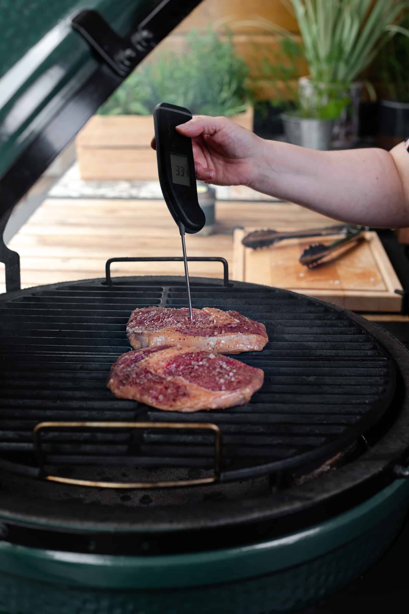 - Steek in de tussentijd de barbecue aan en bereid ‘m voor indirect grillen. Laat de temperatuur oplopen tot 120 graden. Leg de ribeye steaks op een rooster en plaats er een kerntemperatuurmeter in. Doe de barbecue dicht en laat ze garen tot een kerntemperatuur van 42 graden en haal ze daarna van het rooster en verpak in folie.