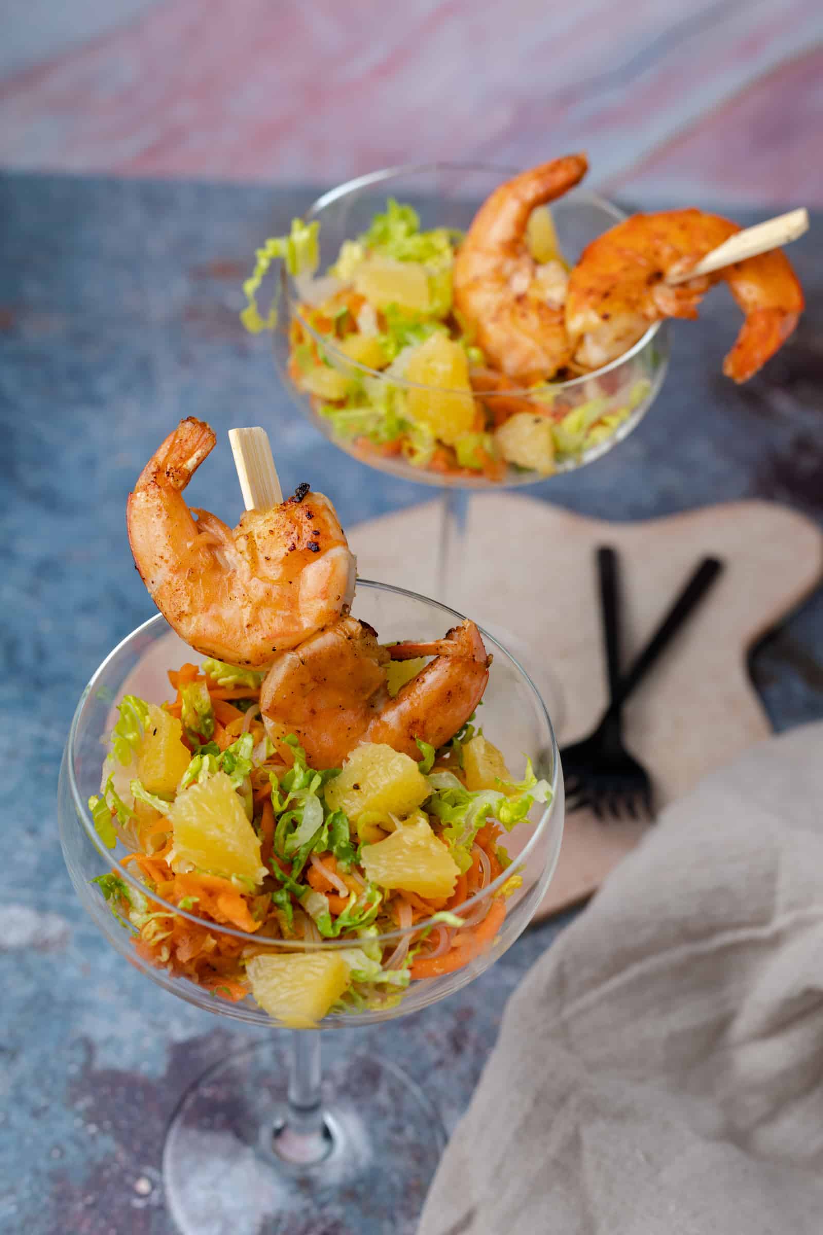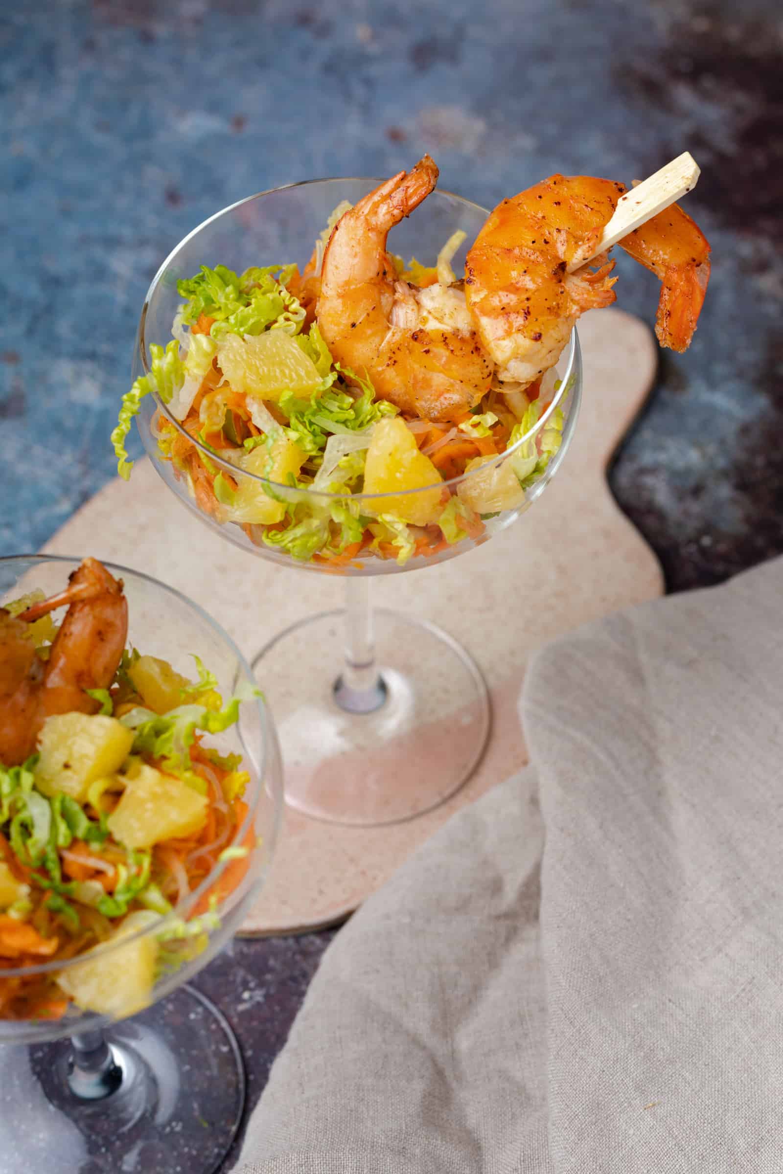 Deze feestelijke Aziatische garnalencocktail maakt de start van je etentje gelijk tot een succes! Heel makkelijk te maken en weer eens wat anders dan de klassieke garnalencocktail. De grote garnalen worden perfect gebakken en geserveerd met een frisse salade met wortel, romainesla, glasnoedels en een sinaasappeldressing.