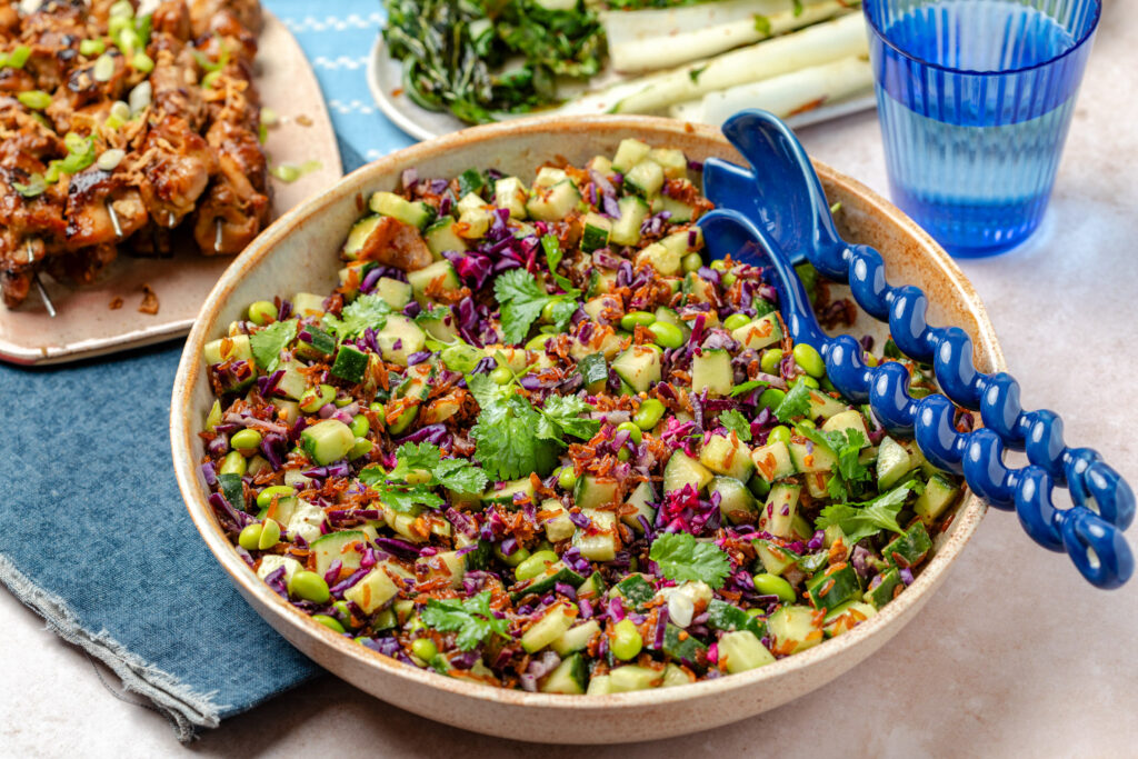 Crispy rice salade met kipsaté en gegrilde paksoi