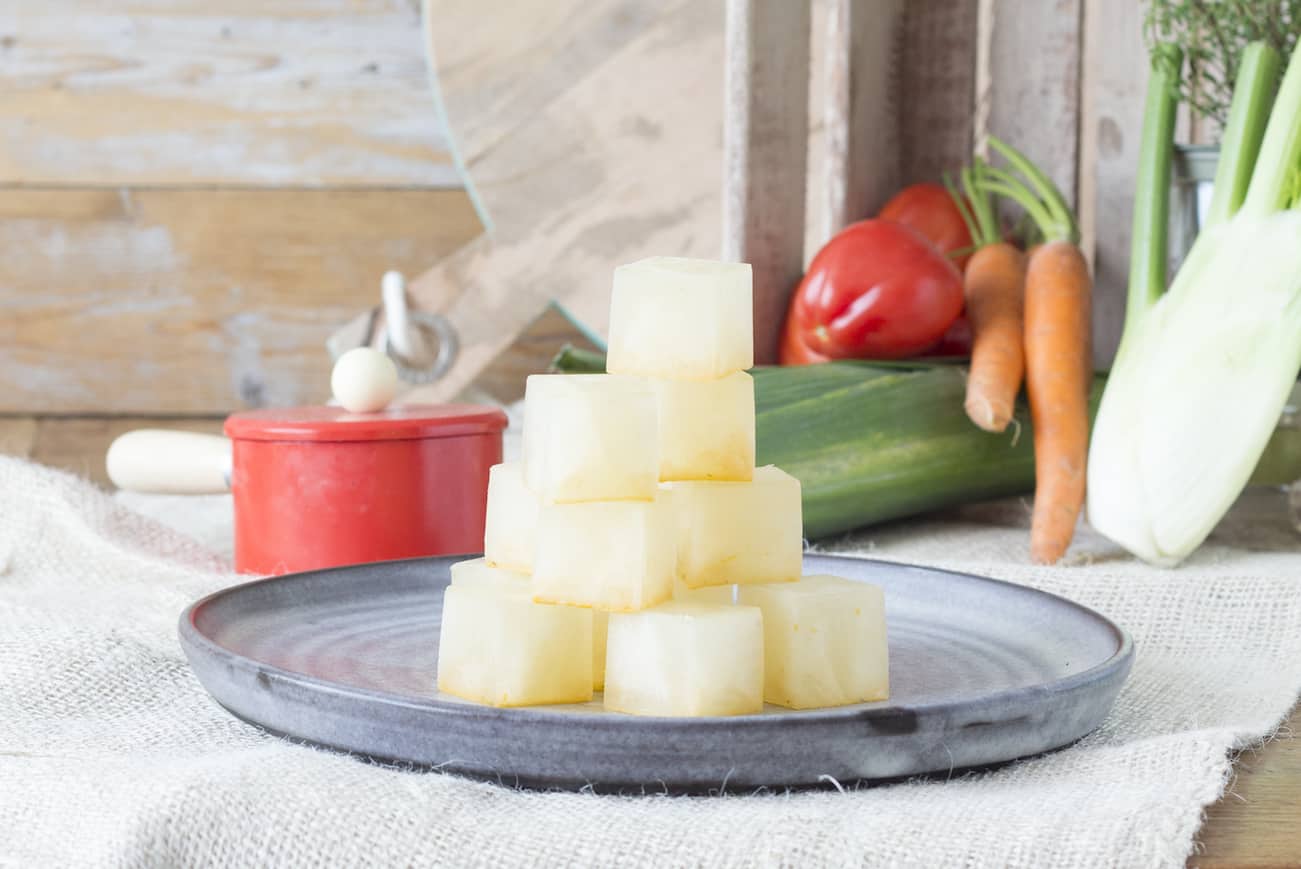 4. Vries de bouillon na het afkoelen in ijsblokbakjes of -zakjes in. Zo kun je makkelijk een portie bouillon uit de vriezer halen. In kleine bakjes kan natuurlijk ook.