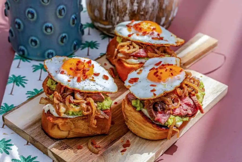 Broodje kip hotdog met gekarameliseerde uien en mosterdketchup