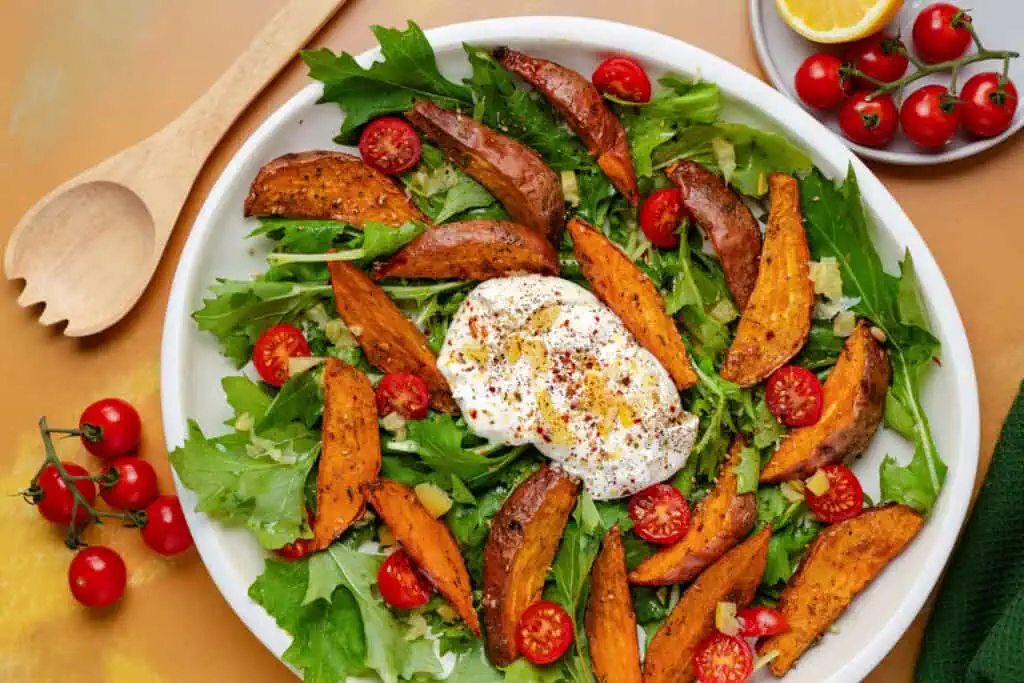 Salade met zoete aardappel, burrata, za’atar en gekonfijte citroen