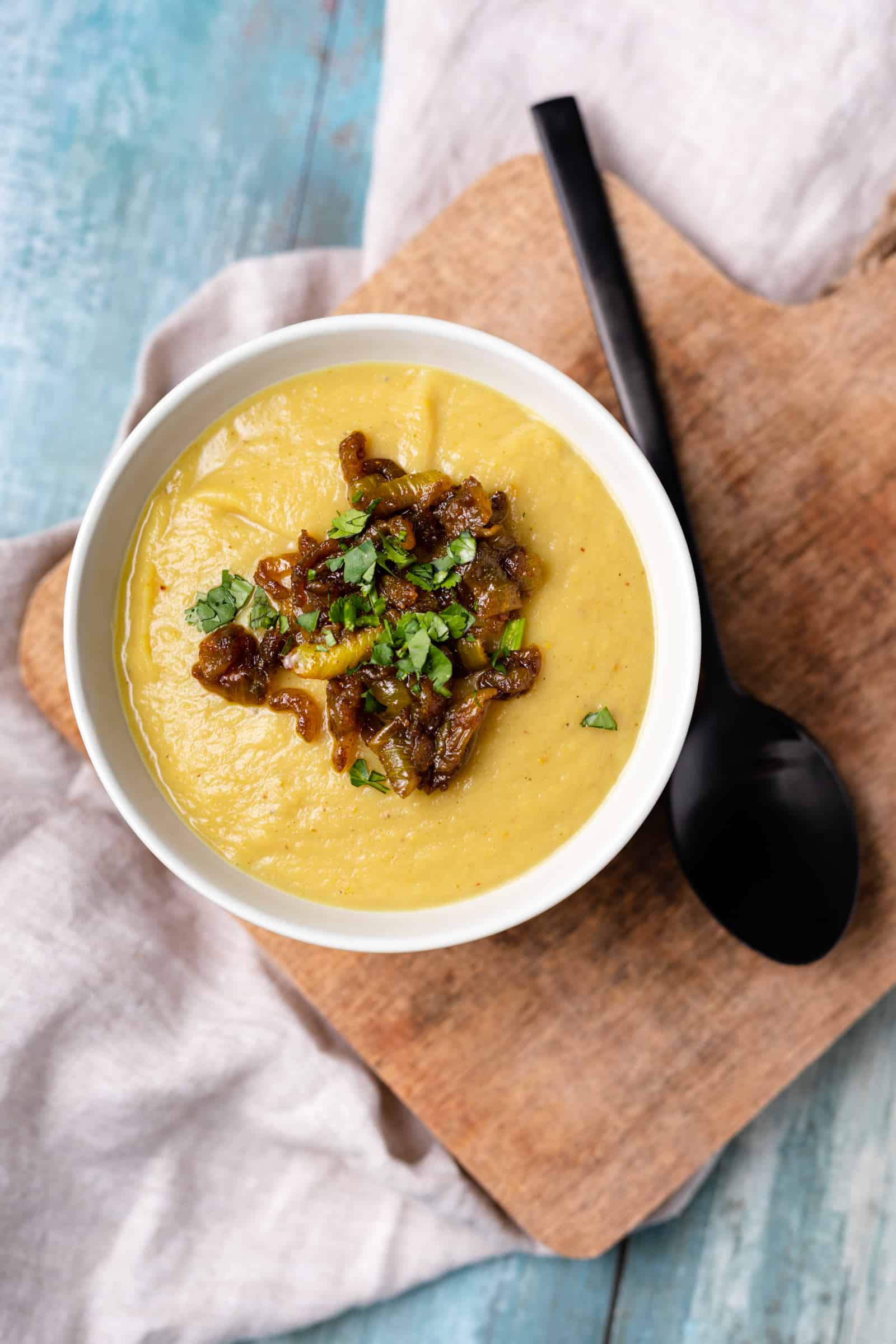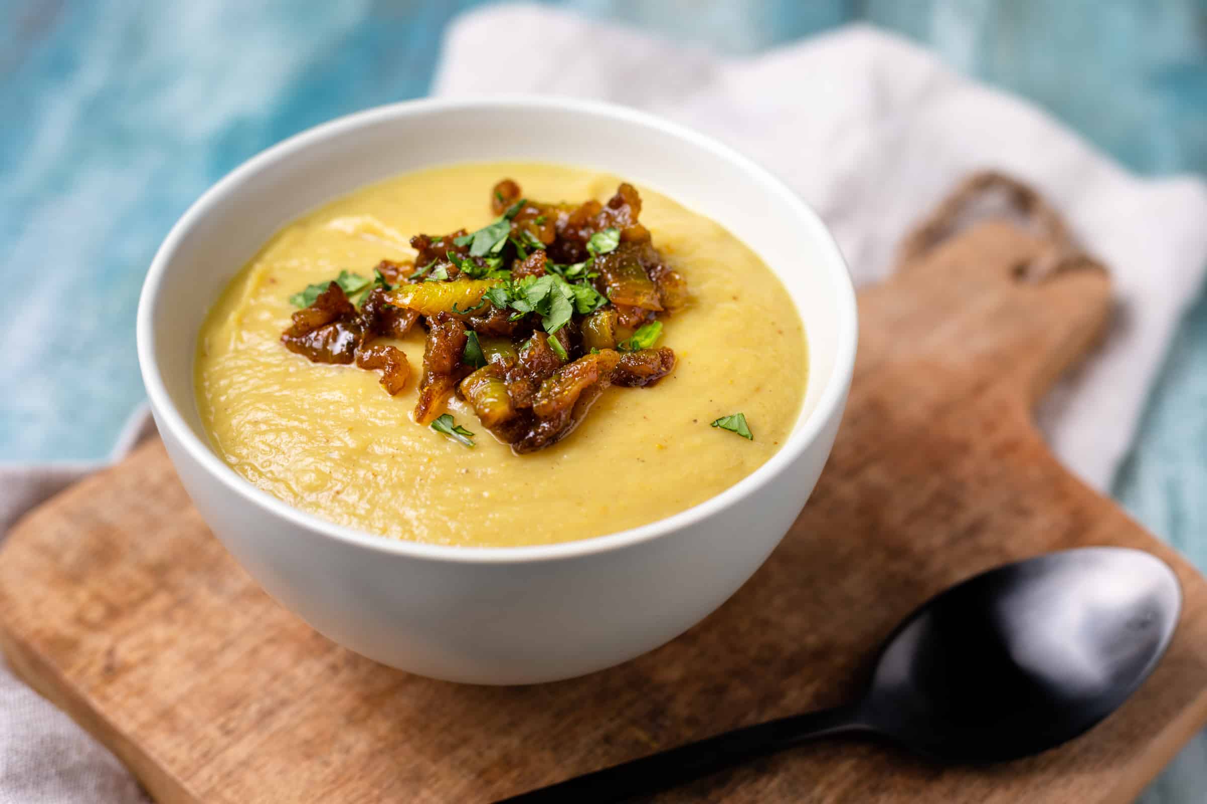 - Combineer het basisrecept met een lekkere topping. Zoals deze gekarameliseerde masala uien, geroosterde noten of pitten, uitgebakken chorizo of plantaardige spekjes, knapperige knoflookcroutons of een lepel pesto. Ook lekker is om wat knolselderij achter te houden, deze in kleine blokjes te snijden en daarna te bakken met appel, noten en verse kruiden. Dit is dan je topping.