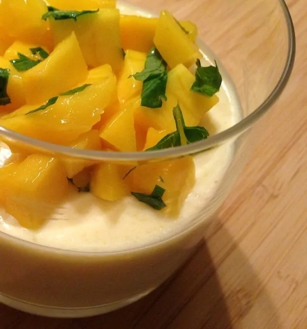 Serveer de bavarois met mango en perzik met de gekoelde blokjes mango met munt.