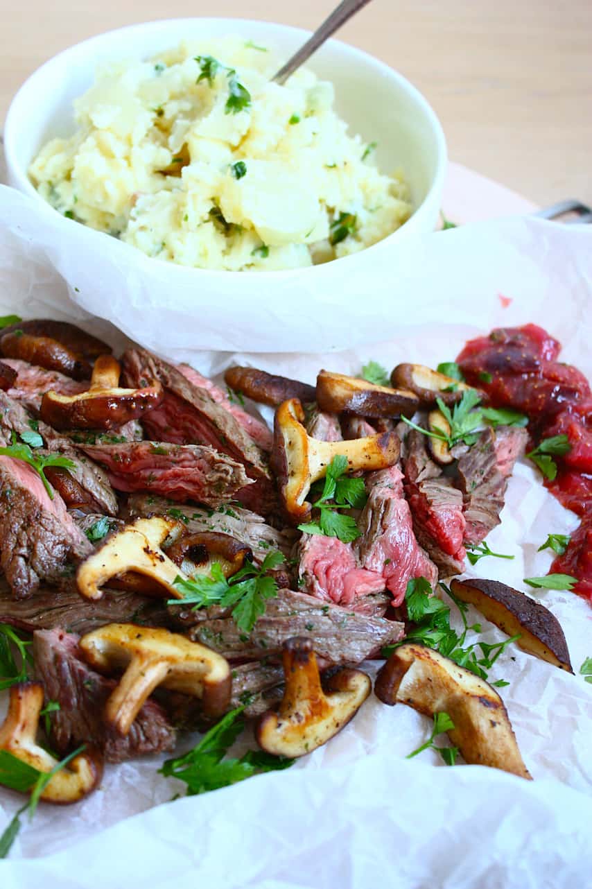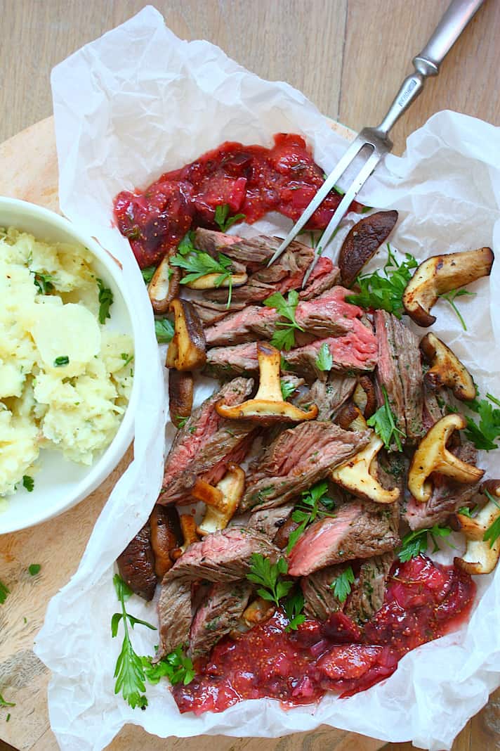 Trancheer de bavette (tegen de draad in) en leg de plakjes op een schaal. Verdeel de shiitake erover en serveer met de chutney en puree. Garneer met grof gehakte kervel. Of, in mijn geval, met peterselie, omdat ik al mijn kervel al had opgemaakt.
