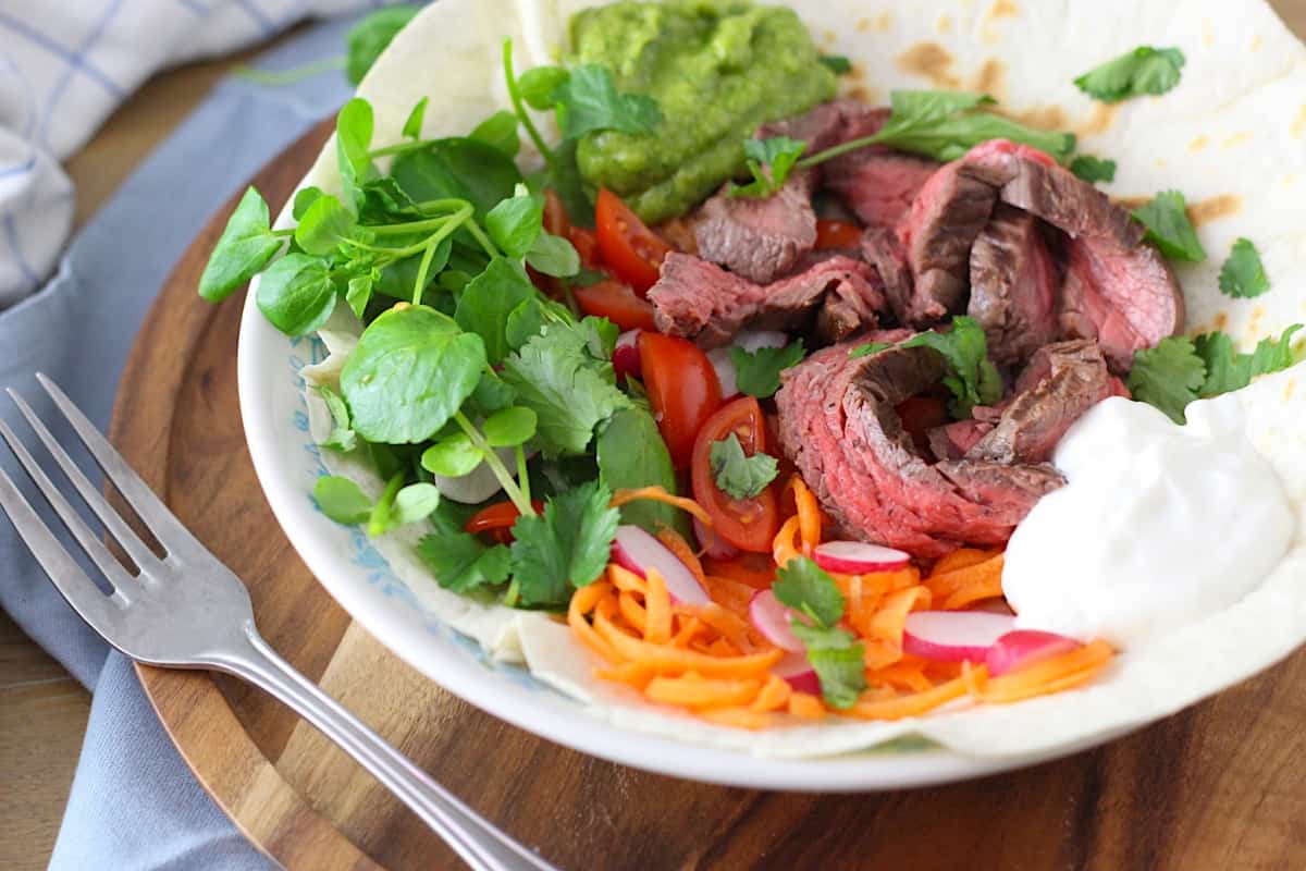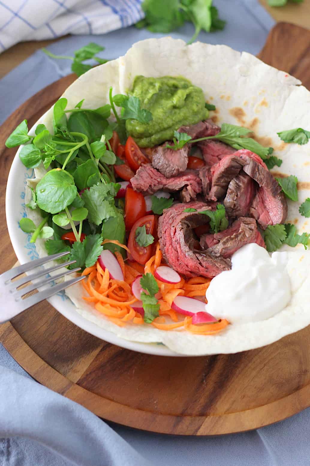 Het is niet voor niets dat ik deze bavette wrap heb opgenomen in mijn 10 favoriete recepten in het ebook. Wat kan ik hier van genieten op vrijdag of in het weekend! En het is niet eens zo moeilijk om te maken. Wees niet bang om de bavette te bakken, zorg ervoor dat deze goed op kamertemperatuur en je pan knetterheet is, bak niet te lang en laat daarna rusten. Dan komt het helemaal goed.