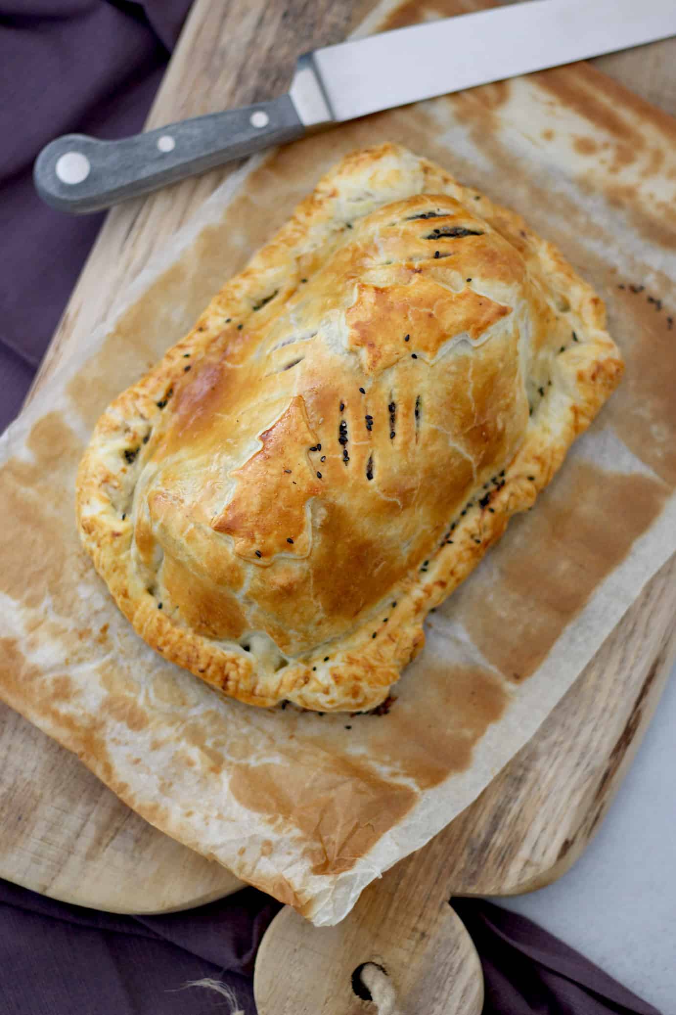 - Rol de tweede rol bladerdeeg uit en leg deze over de bieten heen. Druk dit aan en duw de 2 vellen bladerdeeg rondom dicht. Laat ongeveer 3 cm overlappen en snijd overtollig bladerdeeg weg. Nu sla je de randjes aan de onderkant om en plak je de wellington goed dicht. Maak met een scherp mes een aantal inkepingen in de bovenkant. Deze dienen als ‘schoorsteen’ in de oven.