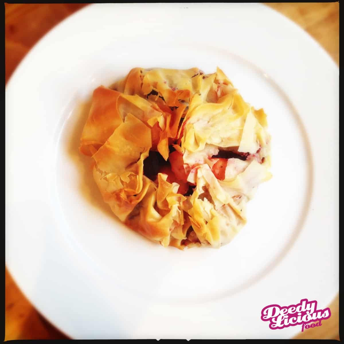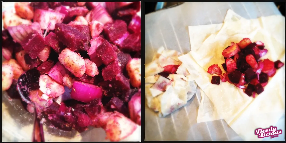 – Vouw de punten van de filodeegvellen naar binnen en druk even goed aan. Het pakketje mag een beetje open blijven staan, maar mag niet open vallen.