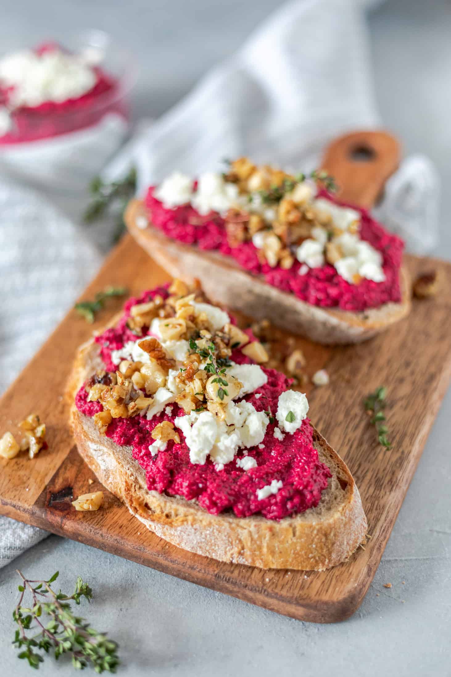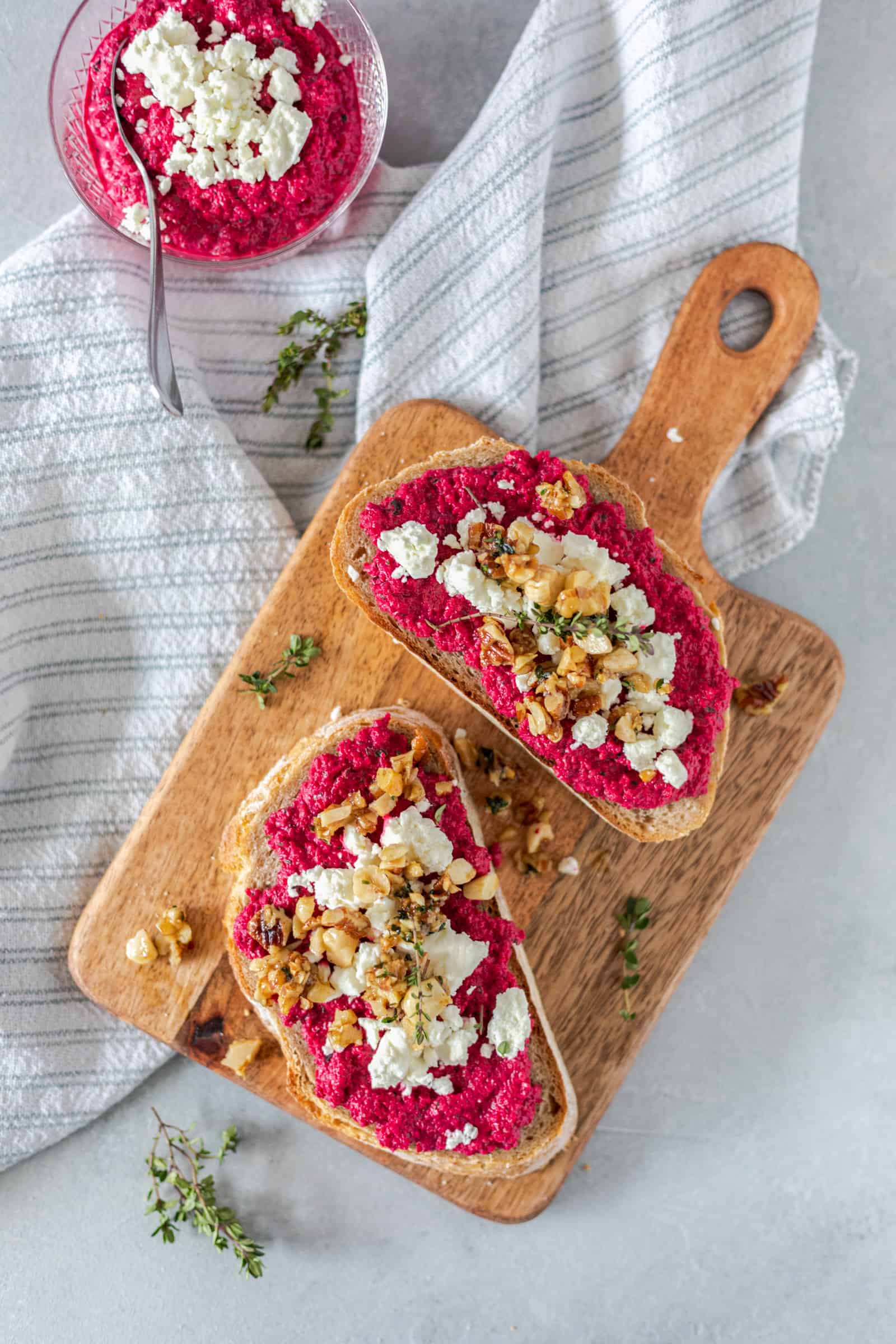 - Serveer de bietenspread op een dik gesneden boterham of op een cracker. Garneer met verkruimelde feta en wat van de gekarameliseerde pecannoten.