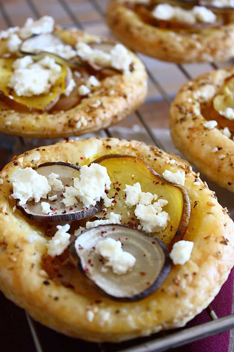 Schuif je bakplaat in de oven en bak de taartjes in 20-25 minuten goudbruin. Houd ze op het laatst goed in de gaten, het kan snel gaan de laatste 5 minuten. Laat je taartjes daarna afkoelen op een rek. Verkruimel de feta over de taartjes en bestrooi eventueel nog met sumak.