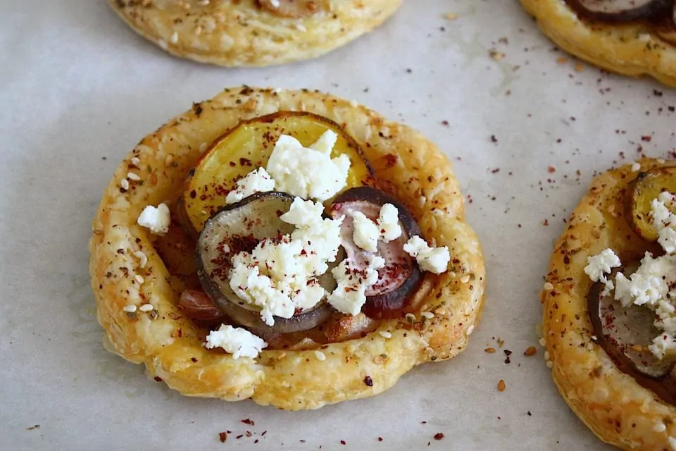 Schuif je bakplaat in de oven en bak de taartjes in 20-25 minuten goudbruin. Houd ze op het laatst goed in de gaten, het kan snel gaan de laatste 5 minuten. Laat je taartjes daarna afkoelen op een rek. Verkruimel de feta over de taartjes en bestrooi eventueel nog met sumak.