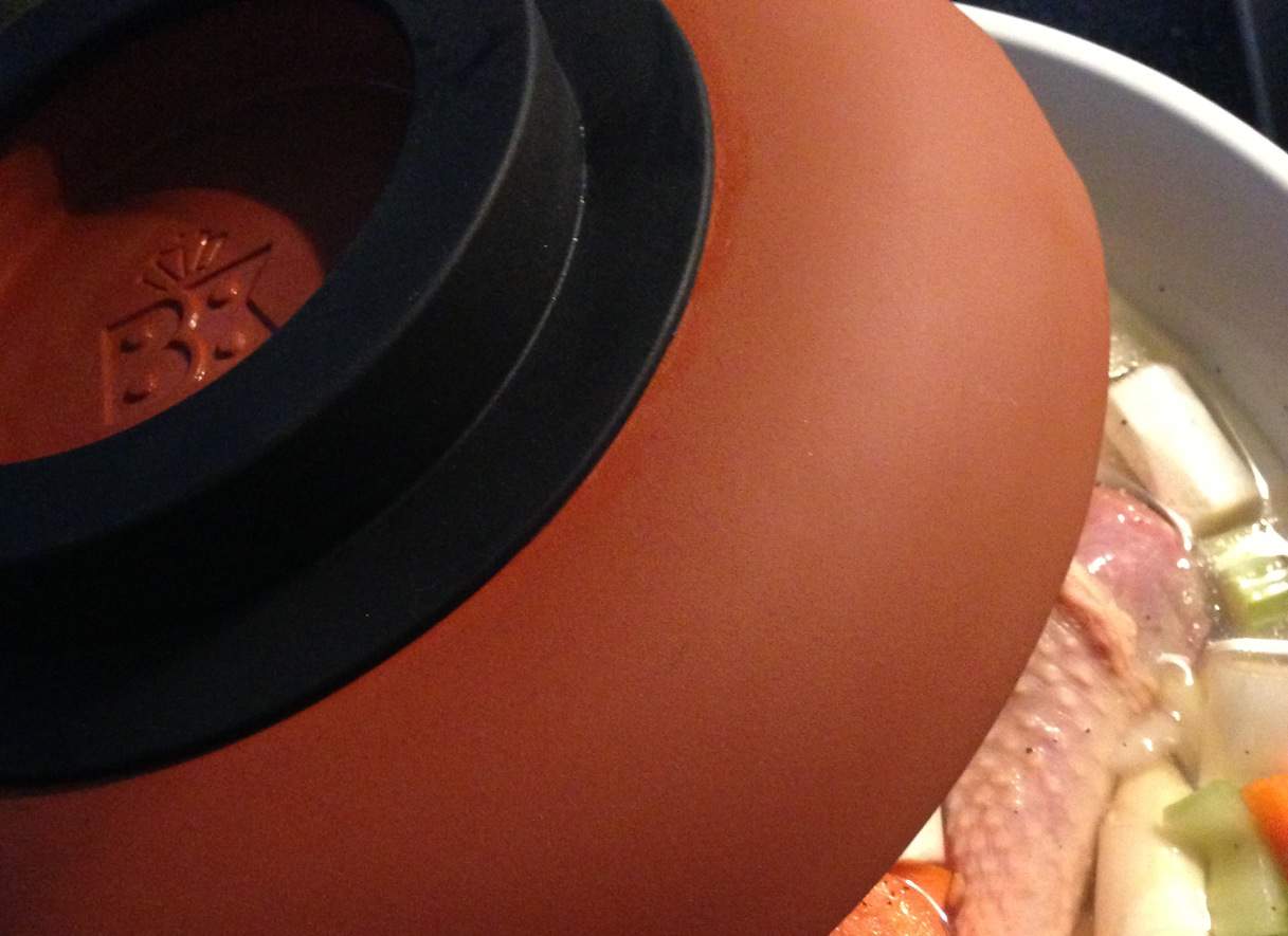 Zoals ik al eerder zei, heel makkelijk. Bij het eerste gebruik was je de 2 aardewerk potten goed af met wat warm water en een beetje afwasmiddel. Voordat je de Slowcooker gaat vullen, week je beide potten eerst 20 minuten in koud water. Hierdoor zuigt het aardewerk zich helemaal vol met water en kan het niet gaan barsten in de warme oven. Daarna vul je de onderste pot met je gewenste ingredienten. Je sluit de pot af met de deksel en zet het geheel in een koude oven. Dat laatste is zeer belangrijk, want het aardewerk moet langzaam mee verwarmen. Zou je de Slowcooker in een warme oven zetten dan breekt het aardewerk geheid.