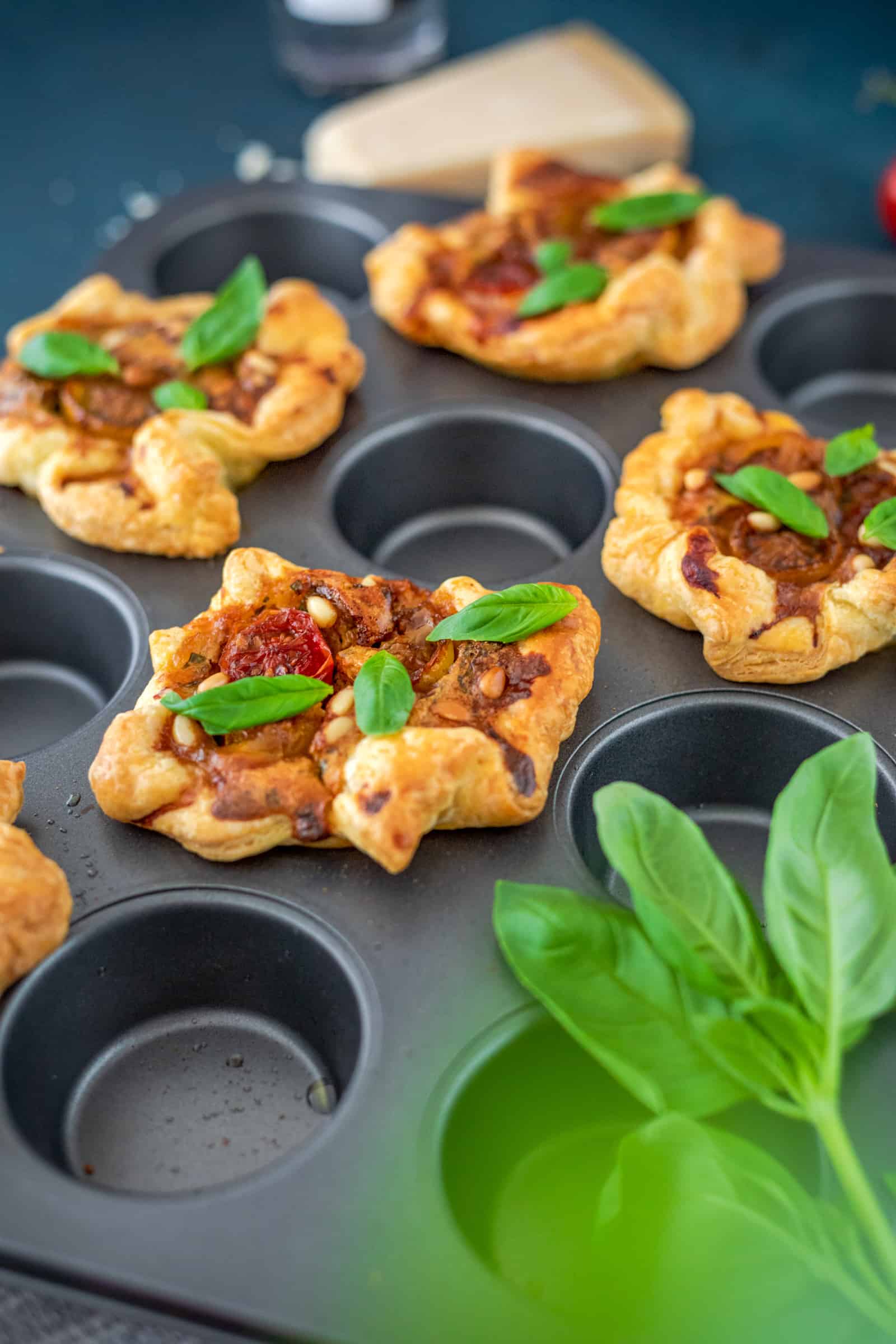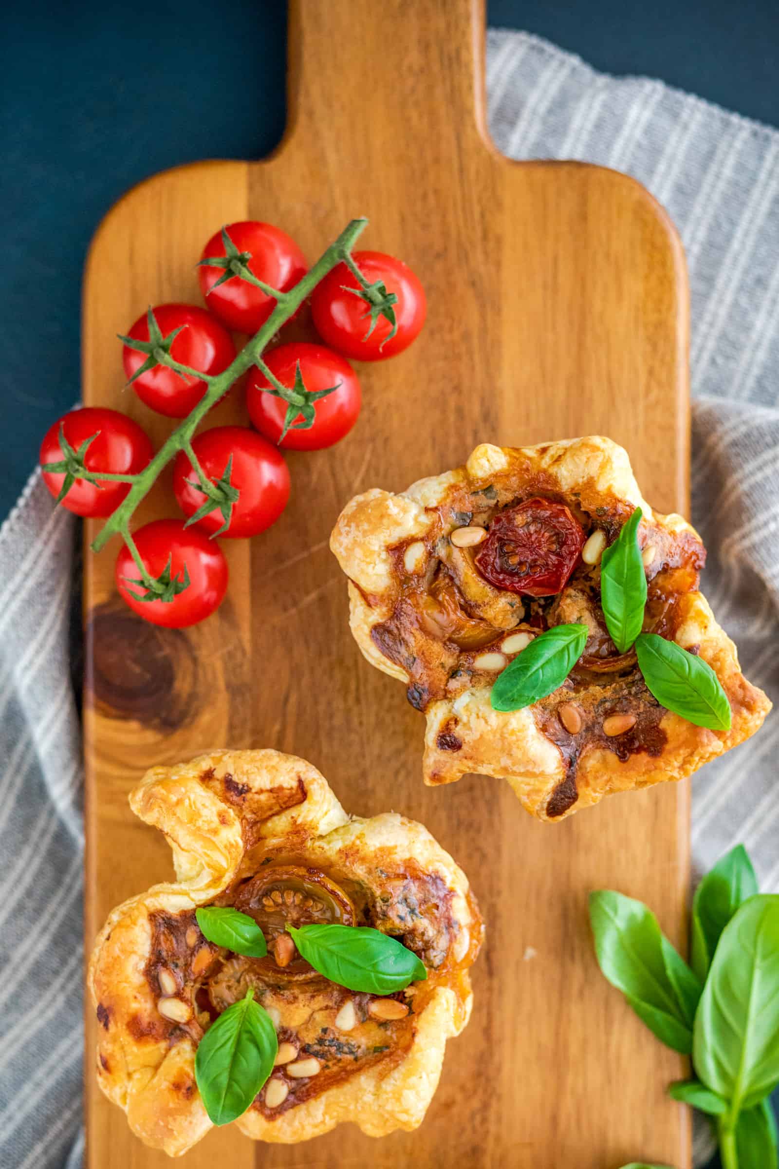 - Serveer de bladerdeegtaartjes lauwwarm en garneer eventueel nog met wat blaadjes basilicum.