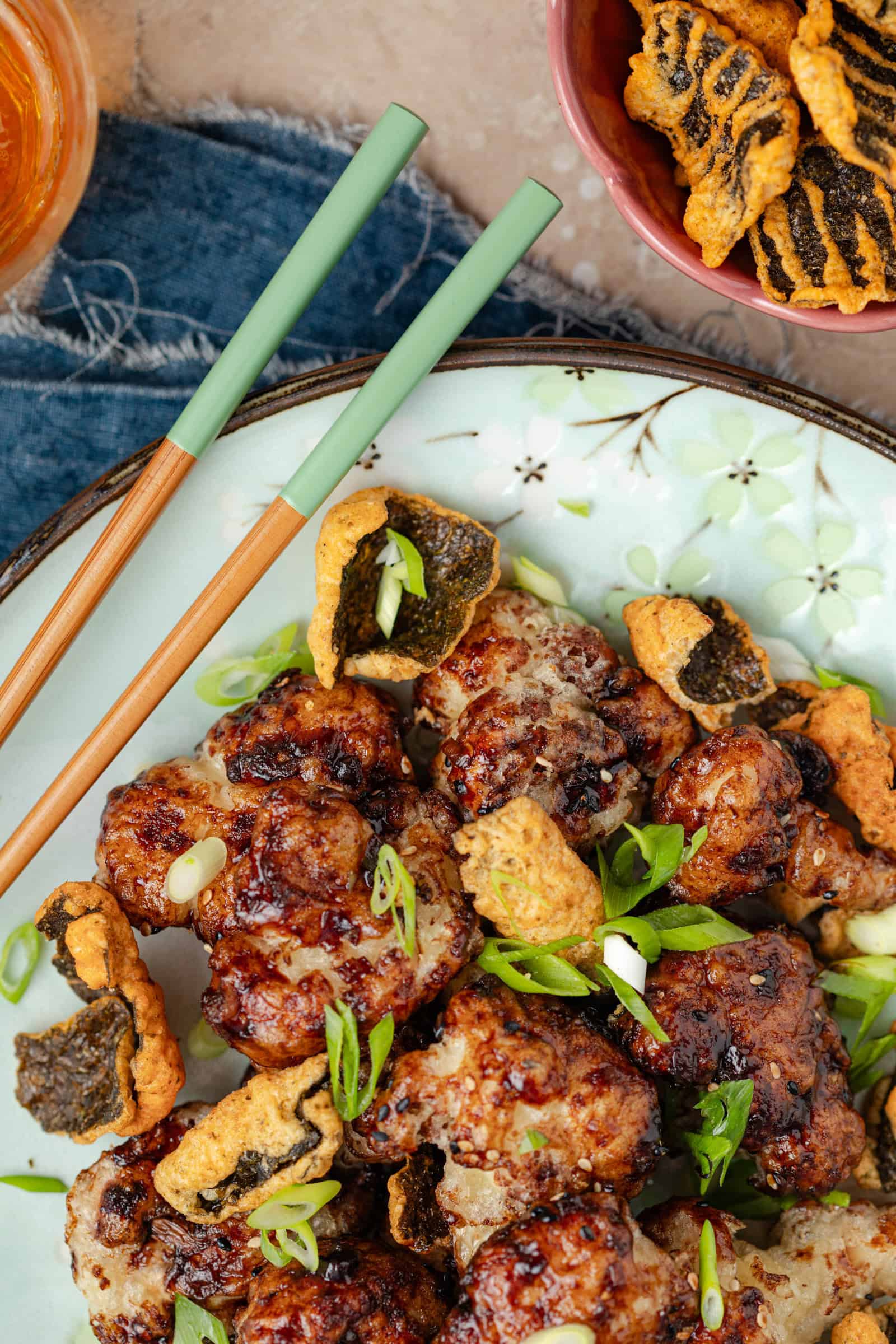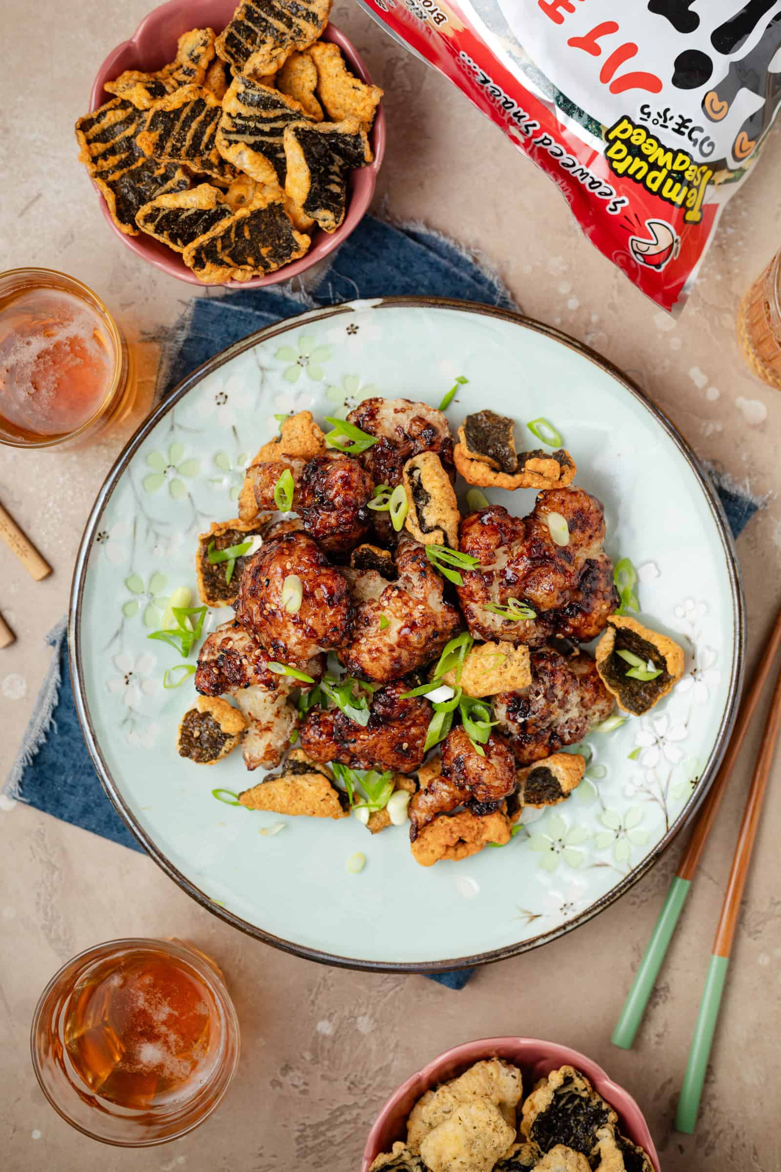 - Schenk de saus over de bloemkool tempura en hussel door elkaar. Serveer op een schaal en garneer met wat zeewierchips en ringetjes lente-ui. Zet de overgebleven zeewierchips ook op tafel en geef je gasten allemaal een setje stokjes.