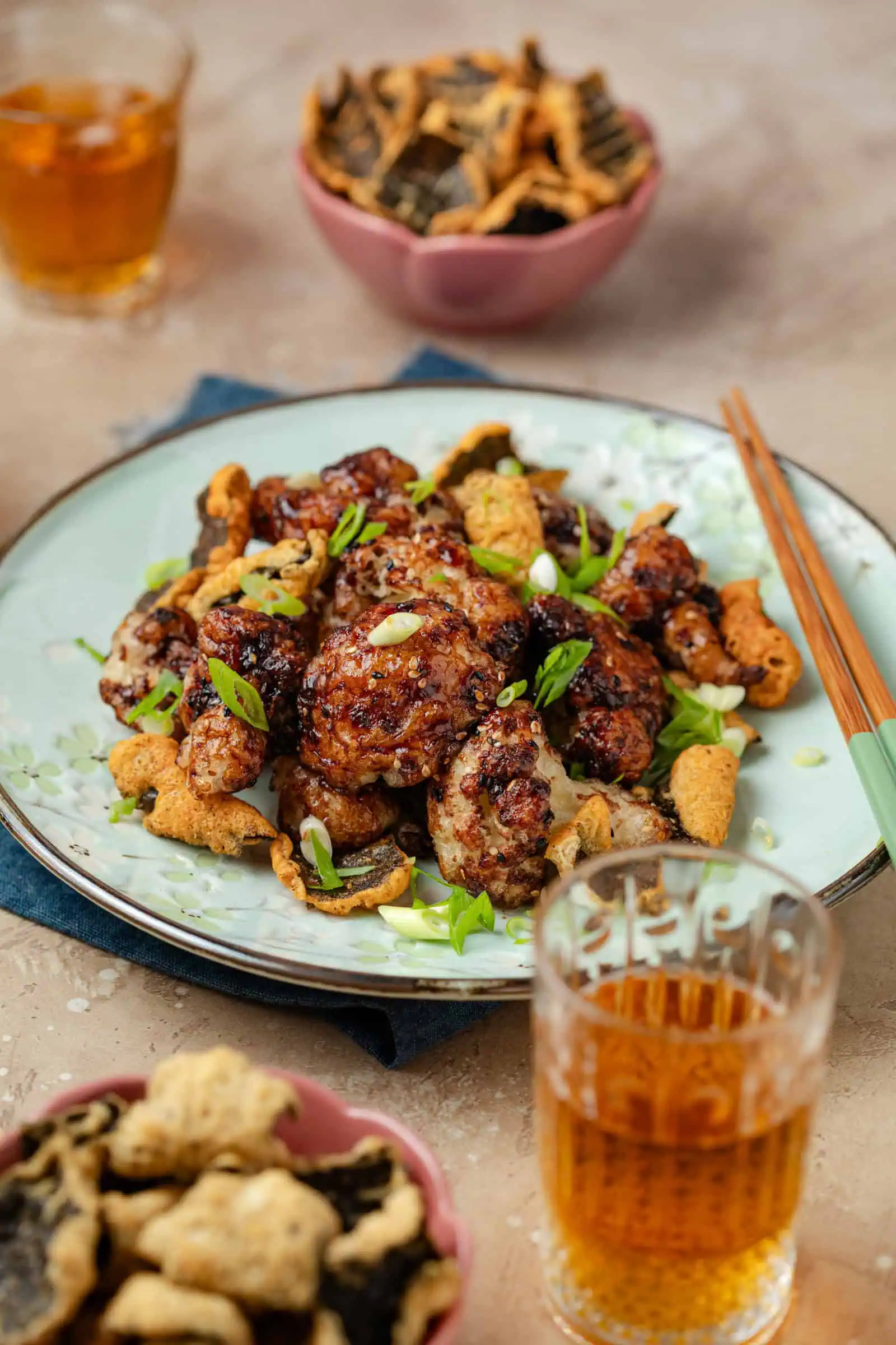- Schenk de saus over de bloemkool tempura en hussel door elkaar. Serveer op een schaal en garneer met wat zeewierchips en ringetjes lente-ui. Zet de overgebleven zeewierchips ook op tafel en geef je gasten allemaal een setje stokjes.