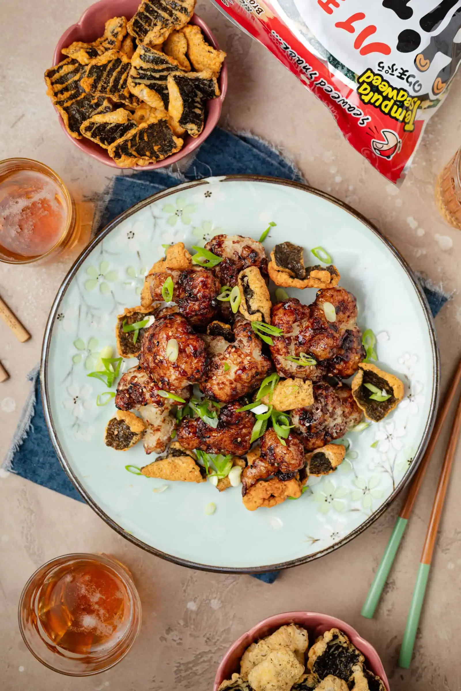 Helemaal verslingerd ben ik aan dit nieuwe borrelhapje. De bloemkool tempura wordt lekker sticky door de kruidige ketjapsaus en combineert perfect met de krokante spicy zeewiersnacks.