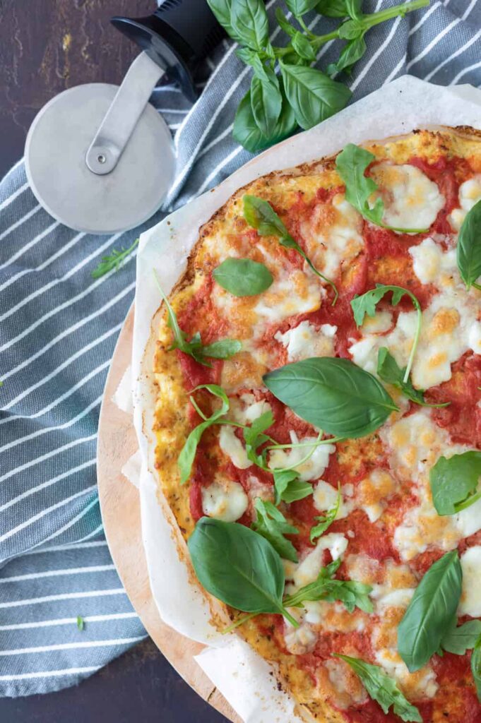 We maakten de bloemkoolpizza margherita als een van de laatste gerechten op onze kookdag en wat we niet deden, wat ik altijd zeg tegen jullie allemaal, is goed lezen… waardoor we de volledige hoeveelheid mozzarella in de bodem hebben gestopt. En da’s niet handig, daar word je bloemkoolpizza dus heel erg papperig van. Opnieuw dus, en het was nogal een klus.