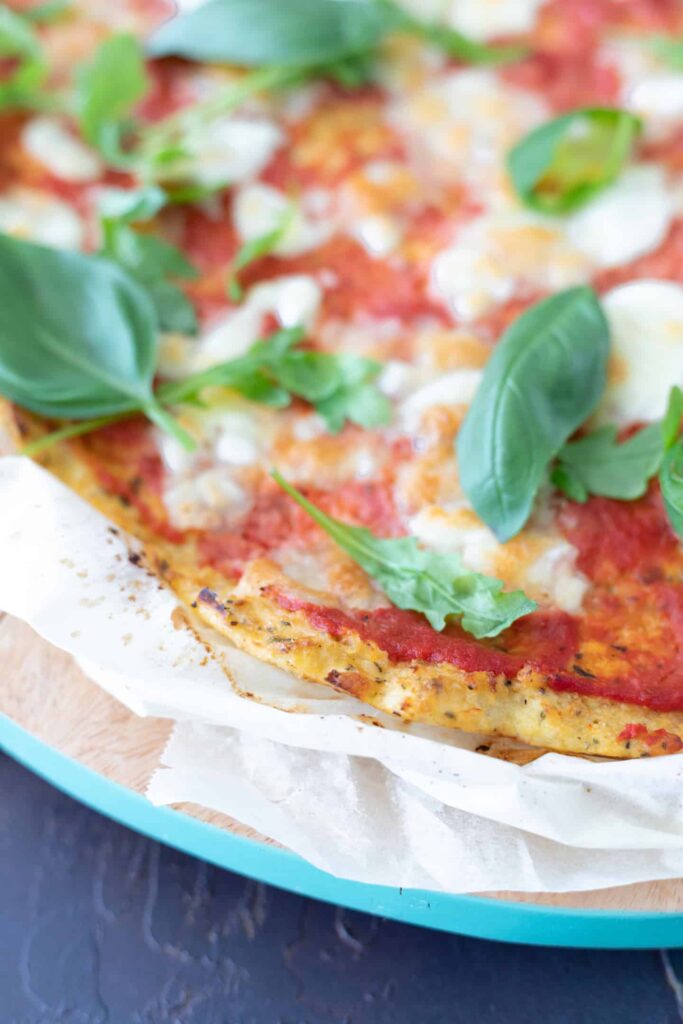 - Spreid het bloemkoolmengsel gelijkmatig over het bakpapier uit. Druk goed aan en zet de bakplaat circa 10 minuten in het midden van de oven, tot de pizzabodem stevig en iets gekleurd is. Mijn oven had hiervoor 15 minuten nodig.
