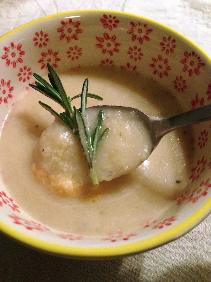 Schenk daarna de bouillon erbij en voeg de gehakte rozemarijn en nootmuskaat toe. Heb je wel eens nootmuskaat zelf geraspt? Je kunt de nootmuskaat noten gedroogd kopen en dan met een klein raspje gebruiken. Qua smaak een enorme verbetering versus de poeder die je in de winkel koopt.