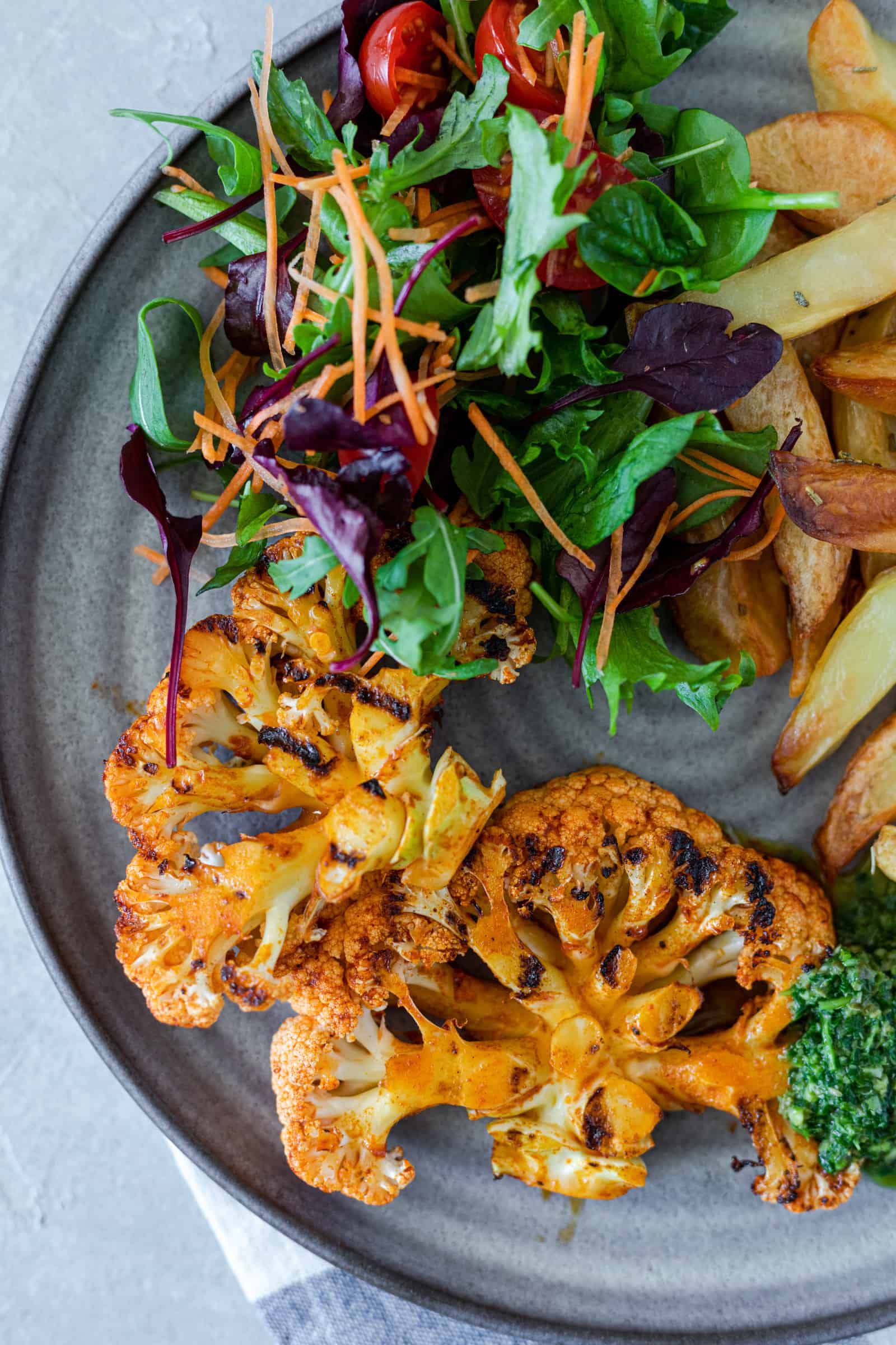 Het gerecht is heel makkelijk om te maken (de aardappel wedges kosten nog de meeste tijd, haha) en heerlijk van smaak. Wij hebben thuis enorm gesmuld van deze bloemkoolsteak, ik hoop dat jullie dat ook gaan doen.