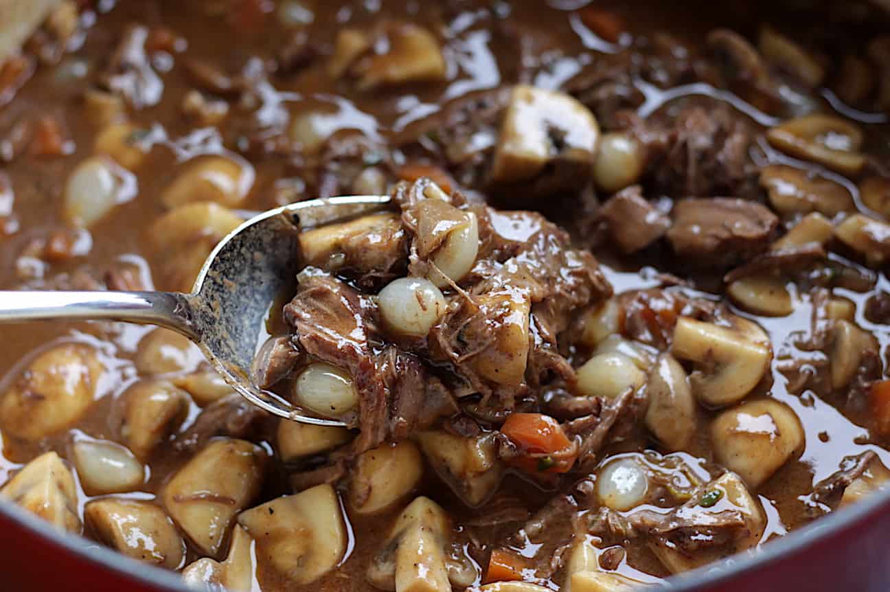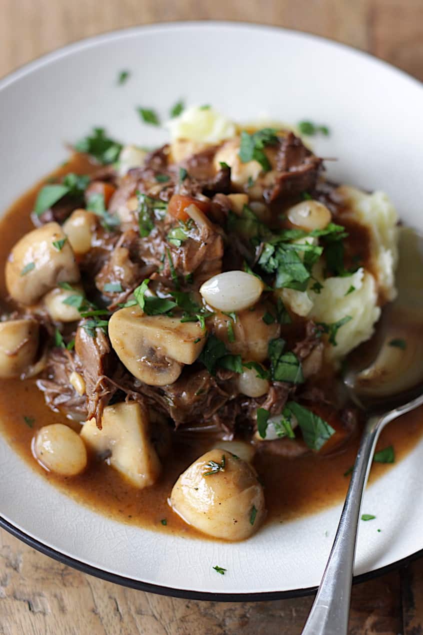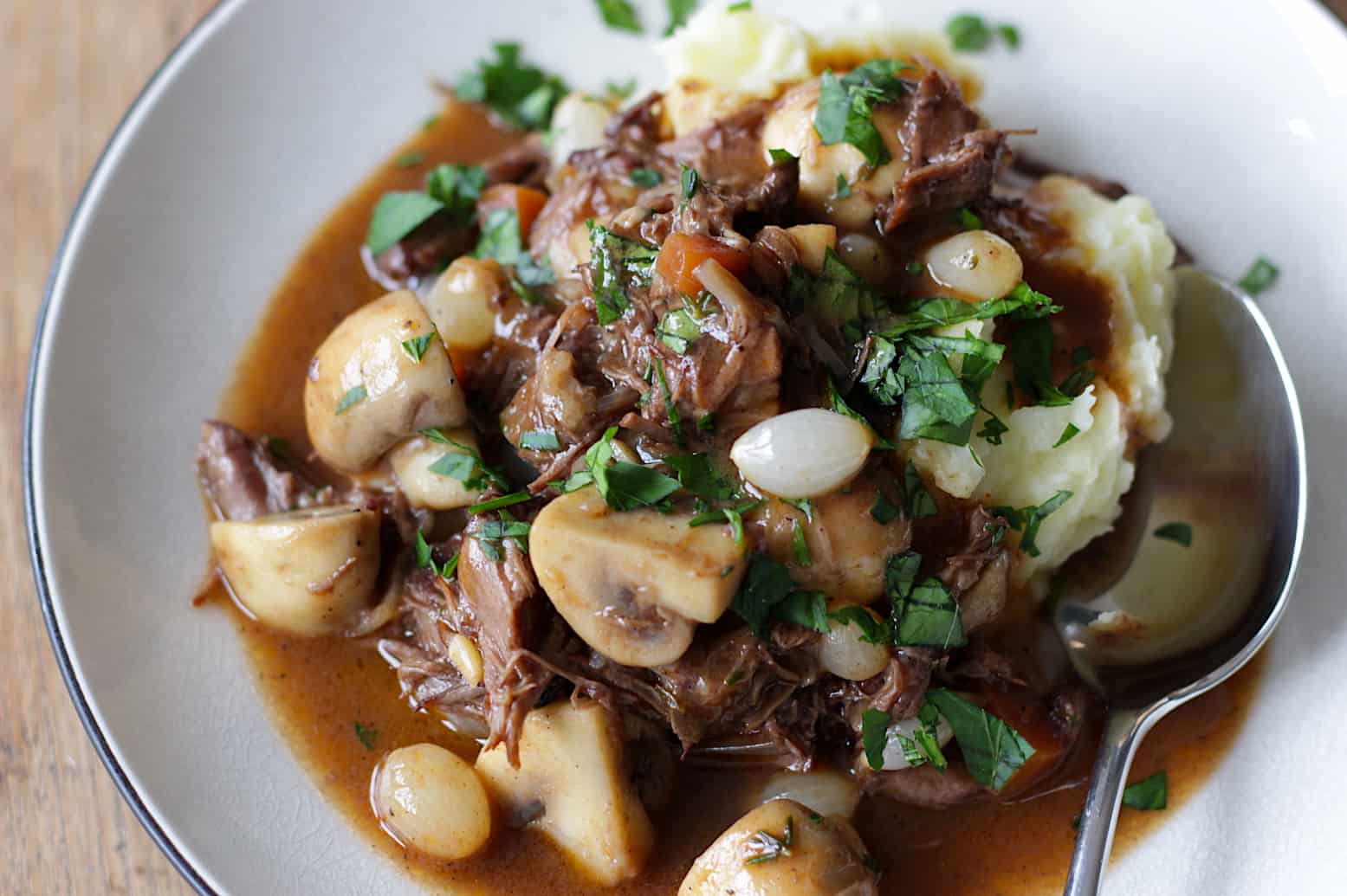 Tip: Een dag later is de smaak van de boeuf bourguignon nog lekkerder dus ik hoop dat je restjes hebt. Verwarm de inhoud van de pan op laag vuur en eet wat over is met stevig brood om in de saus te dopen.
