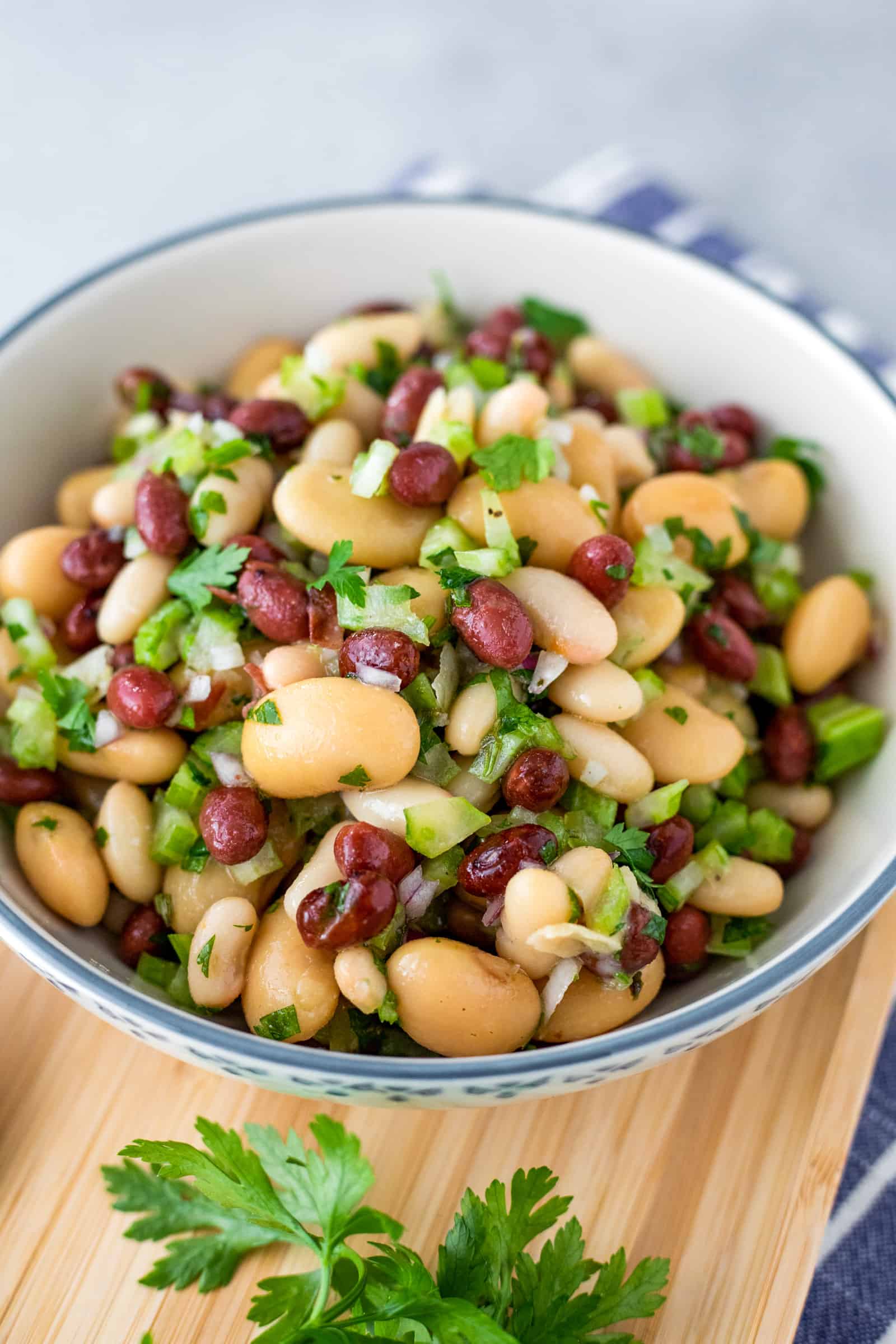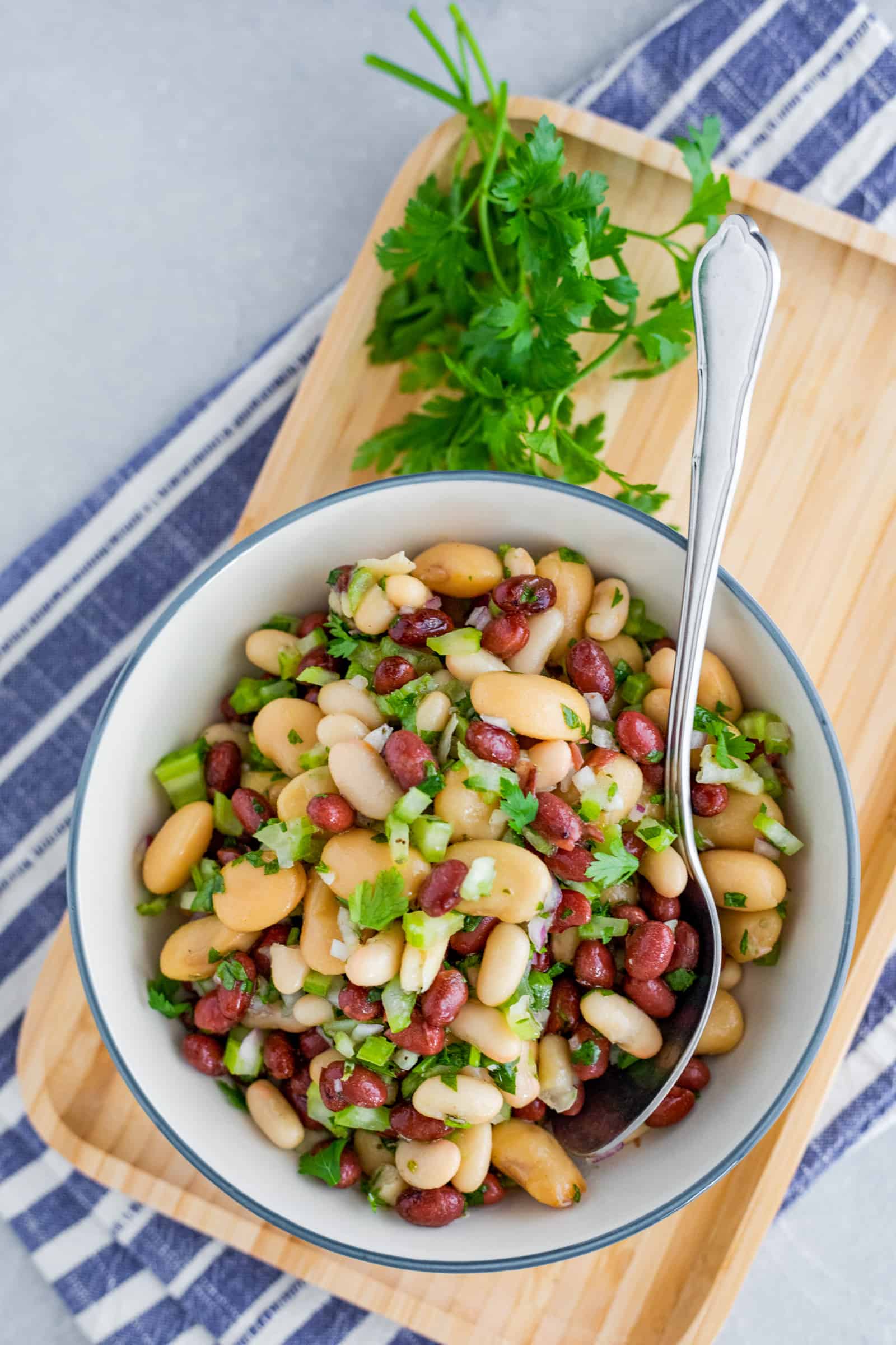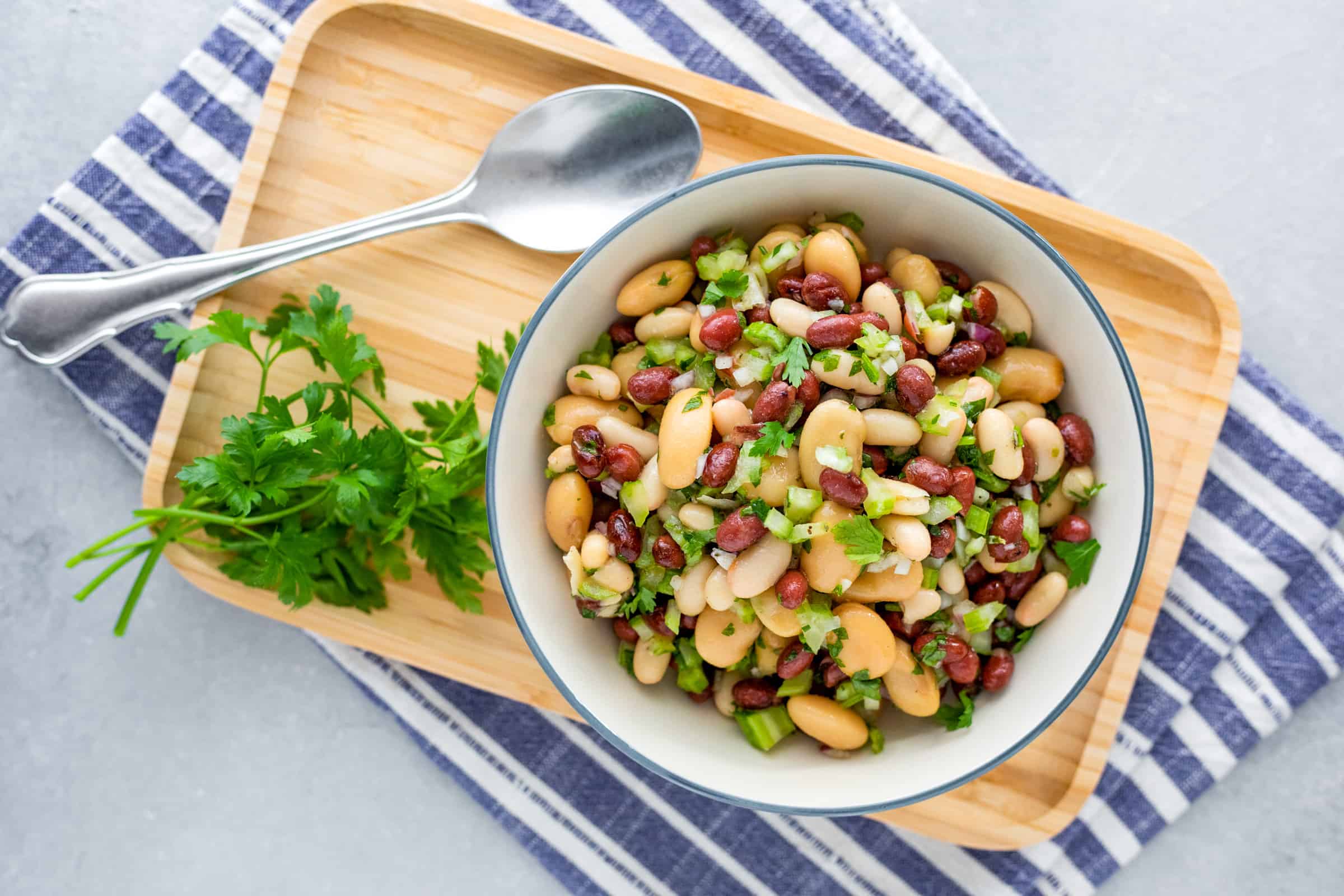 Deze bonensalade maakte ik onlangs toen ik een Amerikaanse barbecue thuis organiseerde. De ‘three bean salad’ is in Amerika vaak een standaard onderdeel van picknicks of potlucks en er zijn tig variaties op te bedenken. Meestal zitten er groene bonen uit pot in, maar die vind ik niet zo lekker dus ik besloot om mijn favoriete bonen uit blik in de salade te verwerken. Met bleekselderij, kruiden en een frisse citrusdressing werd het een heerlijk bijgerecht voor de barbecue. Je kunt ‘m trouwens prima een dag eerder al maken en bewaren in de koelkast, daar wordt de smaak alleen maar lekkerder van.