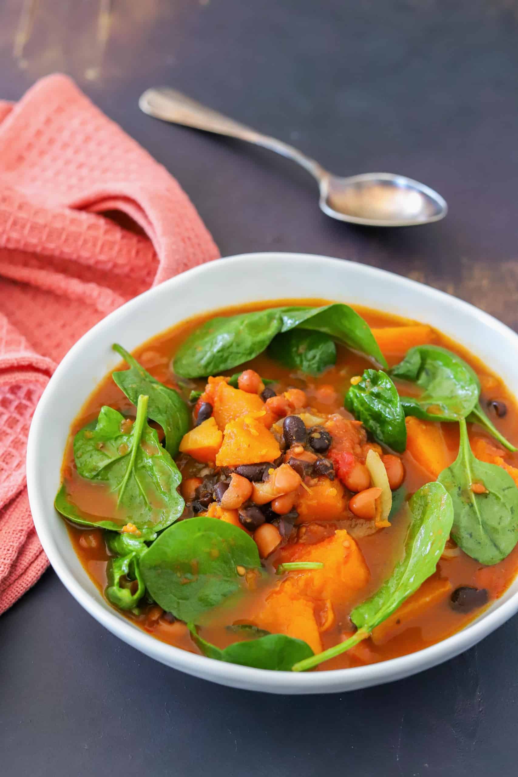 Voor de liefhebbers van bonensoep heb ik vandaag een hele lekkere variant in de aanbieding. Ik maakte namelijk een bonensoep met geroosterde pompoen en currypasta en die was me toch lekker. Boordevol groenten en peulvruchten, een heerlijk begin van de week. En met de kliekjes kun je de volgende dag ook goed lunchen. Geniet ervan!