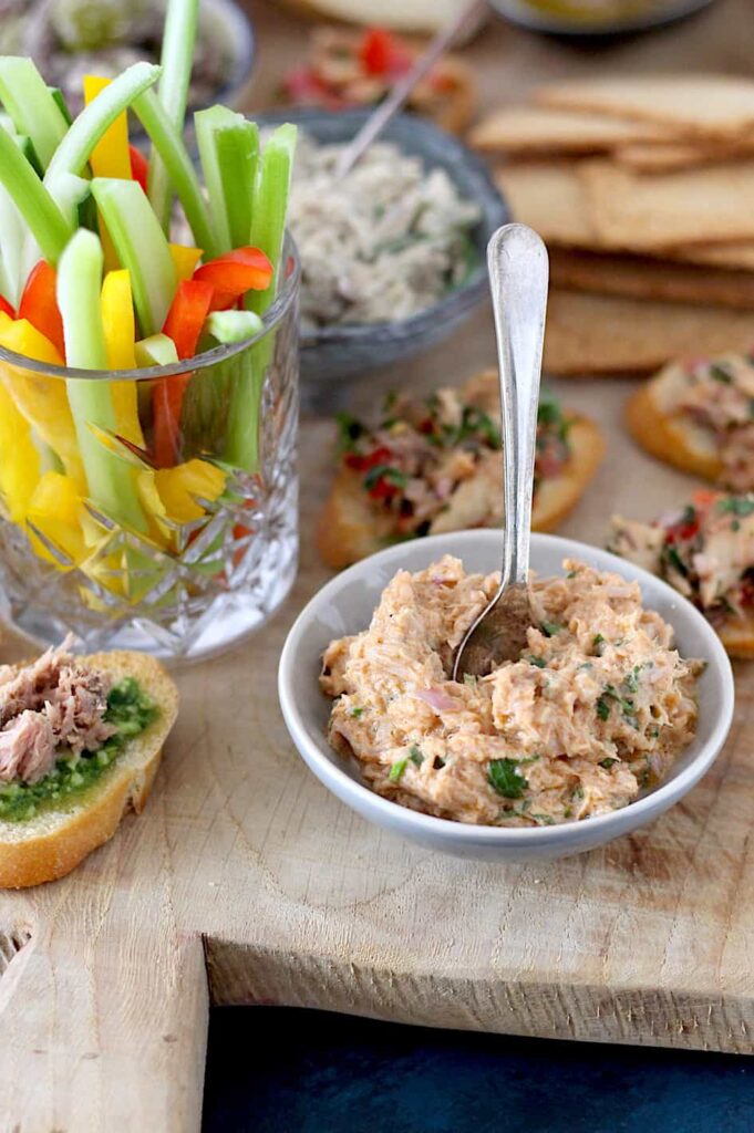Meng 1 blikje uitgelekte tonijn met 1 eetlepel Griekse yoghurt, ½ theelepel gerookt paprikapoeder, ¼ gesnipperde sjalot, kneepje citroensap en 2 fijngehakte takjes peterselie. Breng op smaak met een snufje zout en serveer met krokante toastjes.