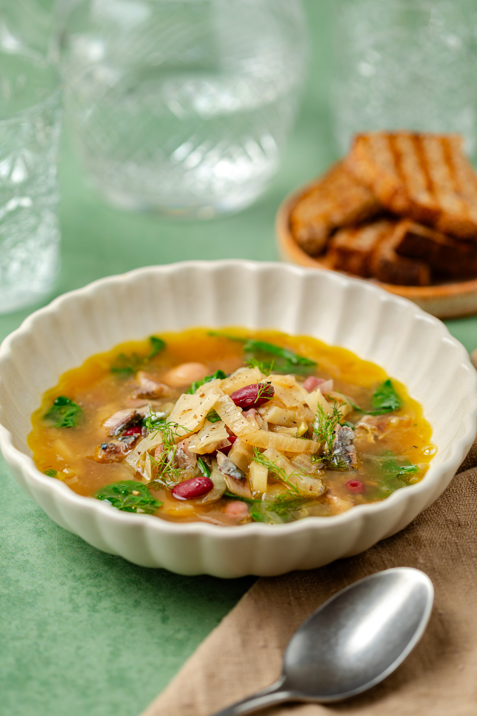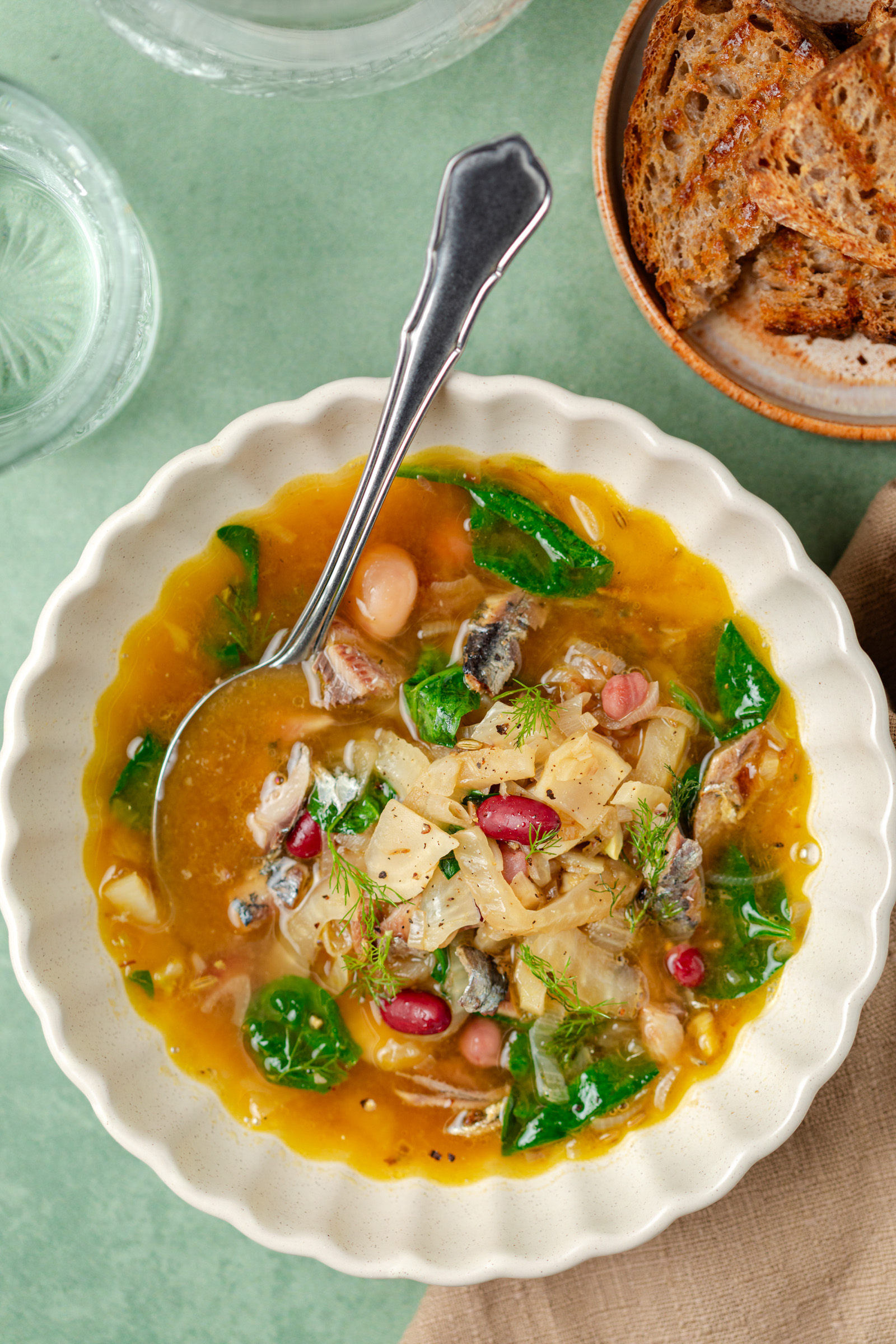 Er zijn van die recepten die je gewoon wilt maken als het buiten guur en donker is. Deze geurige bouillon met venkel, bonen en sardines is er zo eentje. Het is een heerlijk hartverwarmend gerecht dat barst van de smaak, dankzij de frisse venkel, romige bonen en de volle sardines. Of je het nu serveert als voorgerecht, lunch of bij een uitgebreide brunch met knapperig zuurdesembrood, deze soep past altijd. Wat ik er extra fijn aan vind? Het is voedzaam, snel te maken en je kunt er zelfs groente restjes in kwijt. Echt zo’n recept dat je steeds weer wilt maken. Laat de kou maar komen!