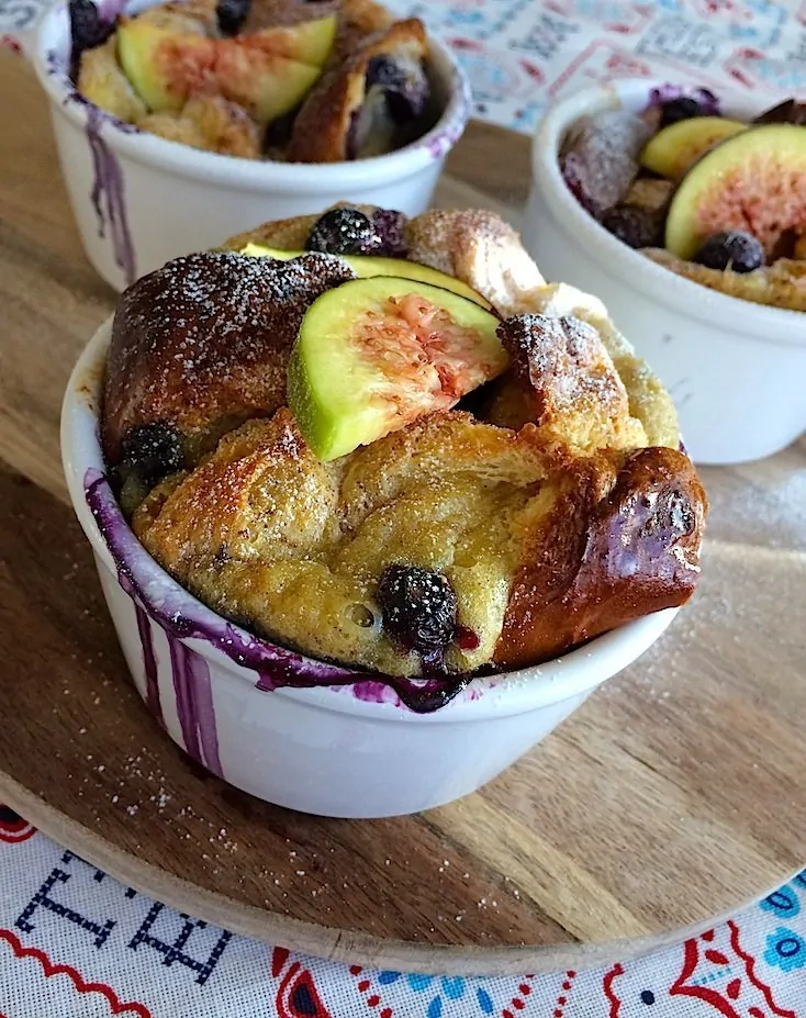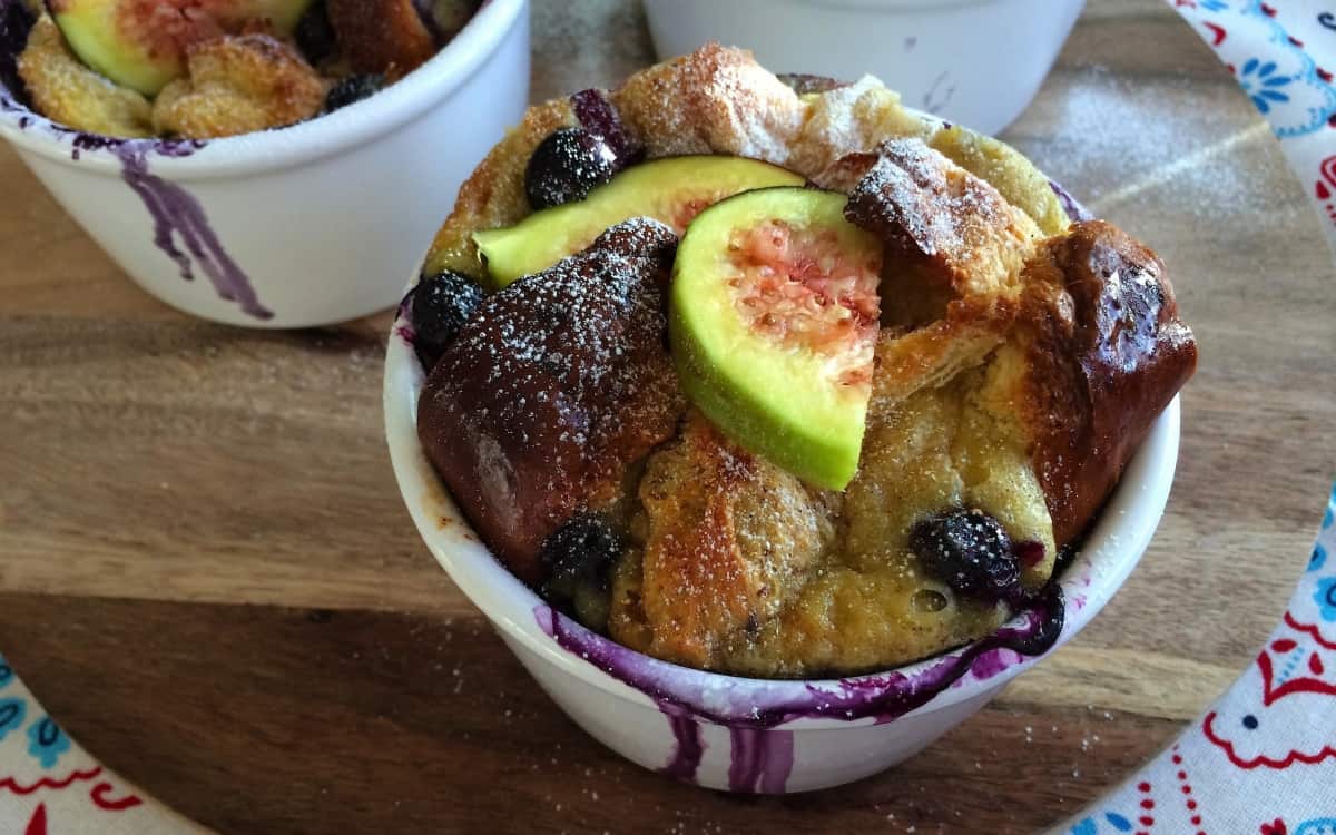 Scheur het brioche brood in grove stukken en stop deze nonchalant in de potjes tot net onder de rand. Klop de eieren los met de slagroom, suiker, vanille extract en kaneel. Verdeel wat blauwe bessen over het brioche brood en schenk daarna het eiermengsel over het brioche brood tot net onder de rand.