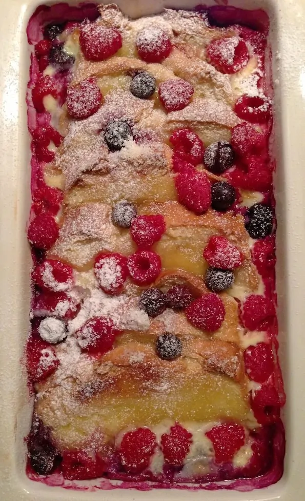 Laat de schaal 5 minuten afkoelen en strooi er dan nog wat poedersuiker over. Serveer deze geweldige brioche wentelteefjes met lemon curd en rood fruit met een bolletje vanille ijs.