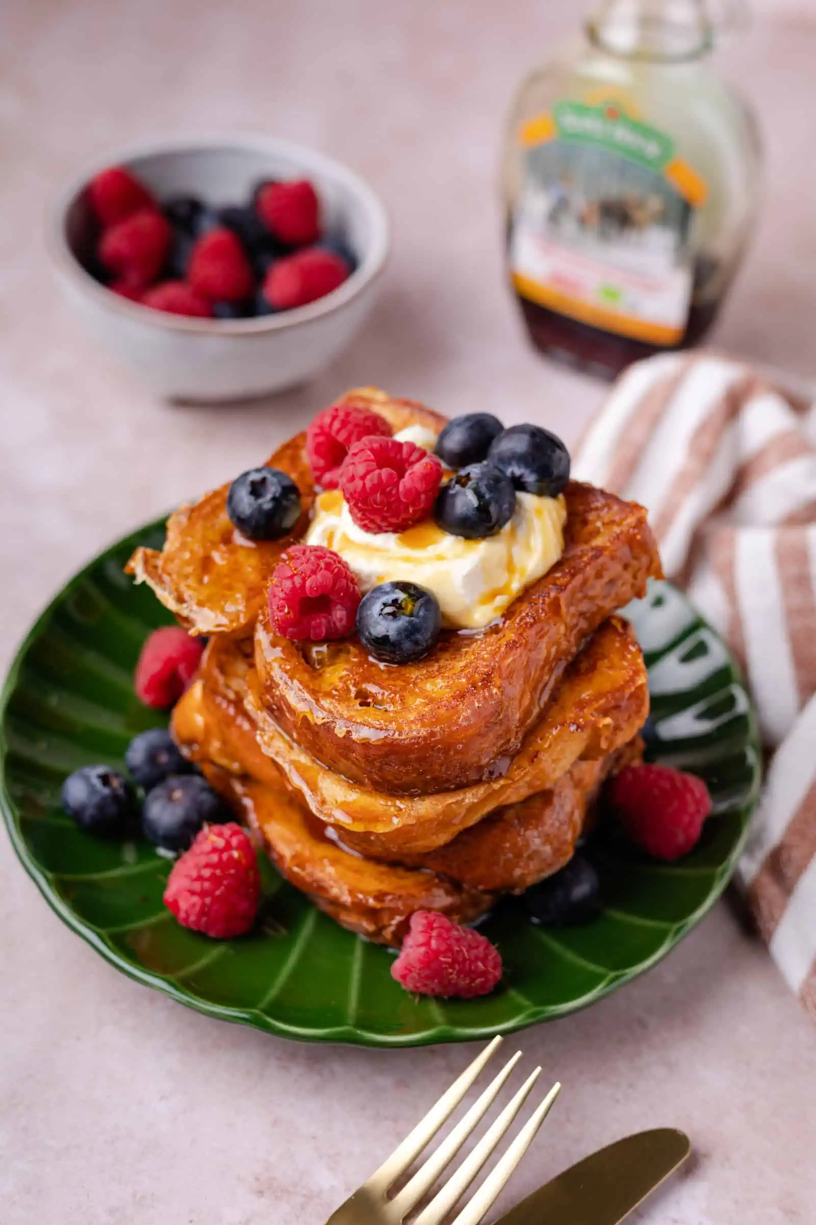 In mijn recept top ik de brioche wentelteefjes af met lemon curd room, rood fruit en ahornisroop. Maar je kunt iedere topping kiezen die je lekker vindt. Met alleen slagroom of een combinatie van Griekse yoghurt en room. En in principe zijn alle soorten fruit bruikbaar, wij vinden de combinatie van banaan, gesmolten chocolade en ahornsiroop ook heel lekker.