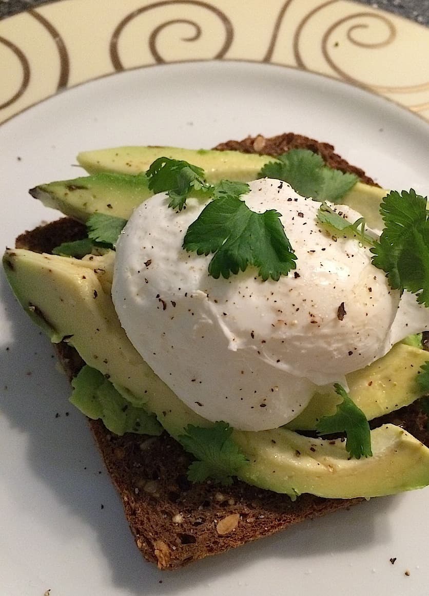 Leg het geroosterde broodje op een bordje en leg hier de helft van de avocadoreepjes op. Het gepocheerde ei gaat hier weer bovenop. Breng op smaak met zeezout en royaal wat zwarte peper en strooi er blaadjes koriander over. Direct serveren en genieten!