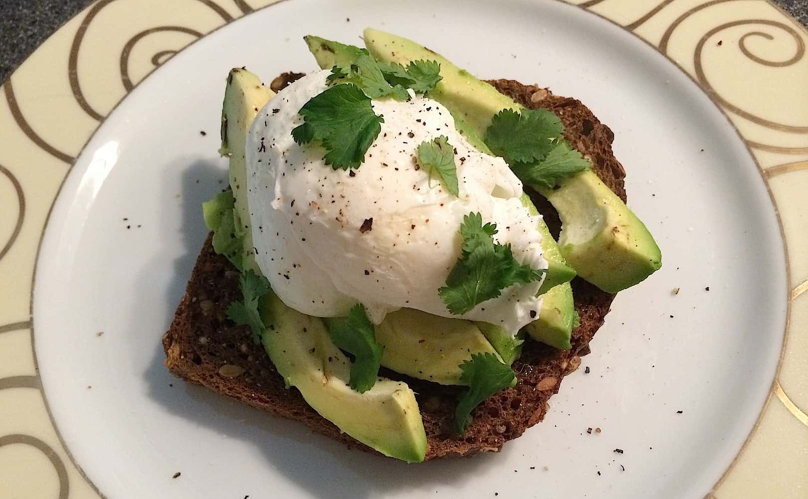 Leg het geroosterde broodje op een bordje en leg hier de helft van de avocadoreepjes op. Het gepocheerde ei gaat hier weer bovenop. Breng op smaak met zeezout en royaal wat zwarte peper en strooi er blaadjes koriander over. Direct serveren en genieten!
