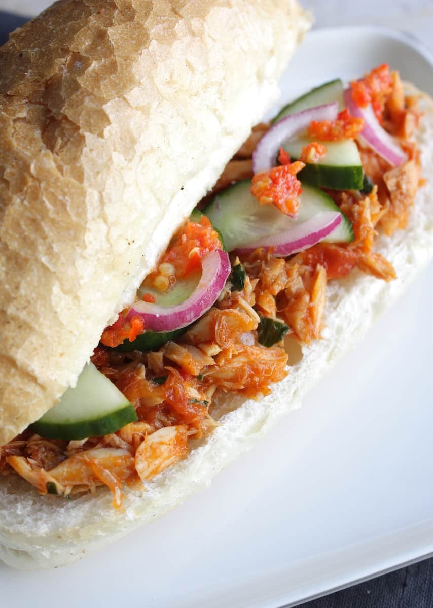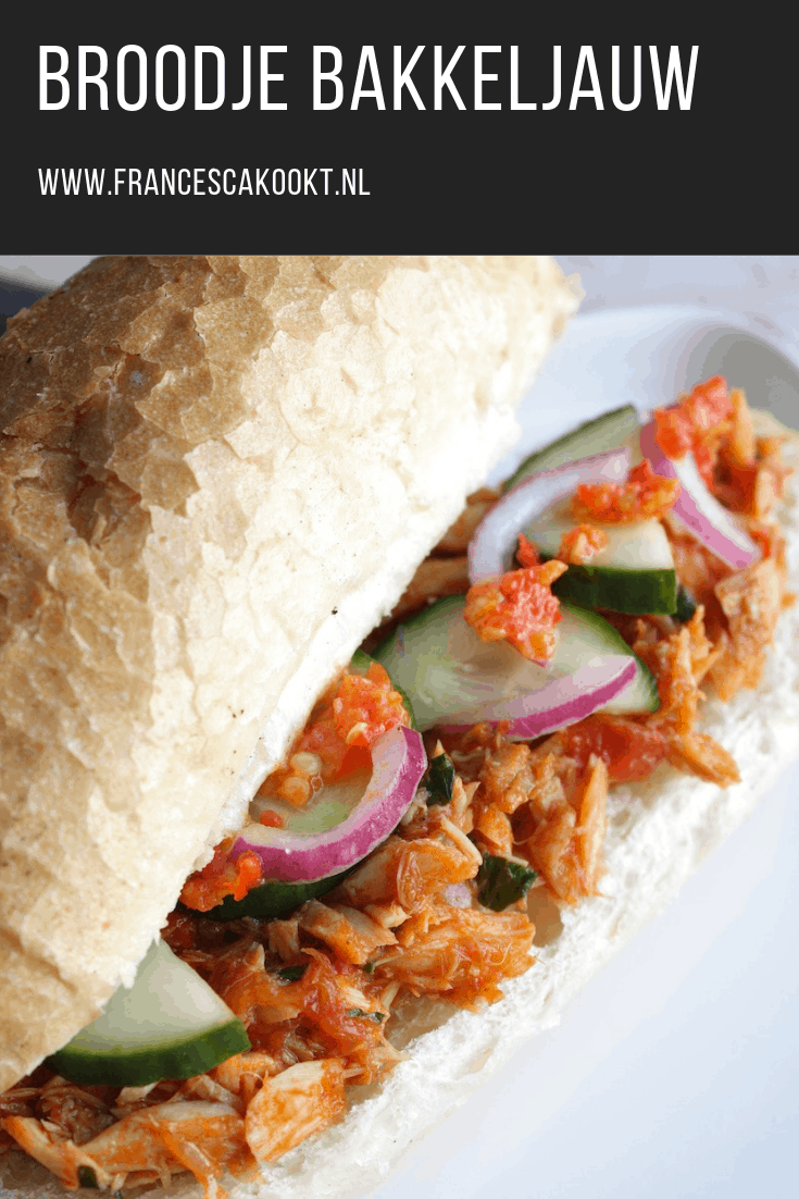 Beleg een broodje met een royale hoeveelheid van de bakkeljauw, leg er wat komkommerzuur op en voeg sambal naar smaak toe. Als je houdt van gepeperde bakkeljauw kun je natuurlijk ook peper meebakken. Ik doe dit alleen niet, omdat we thuis ook nog een peuter hebben die mee eet.