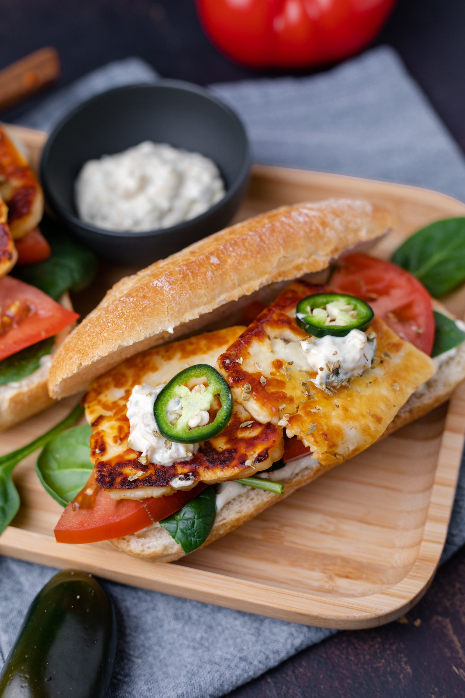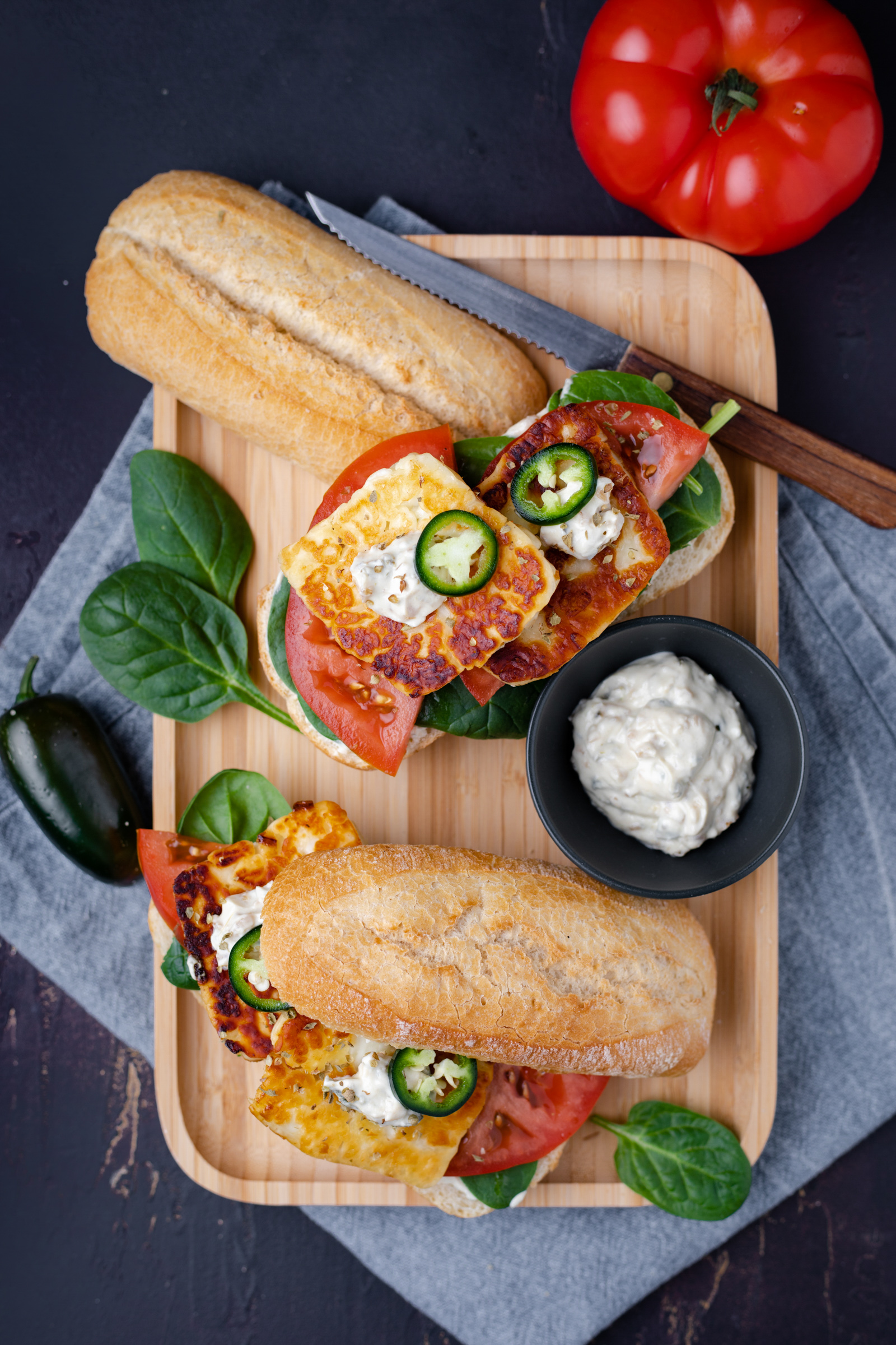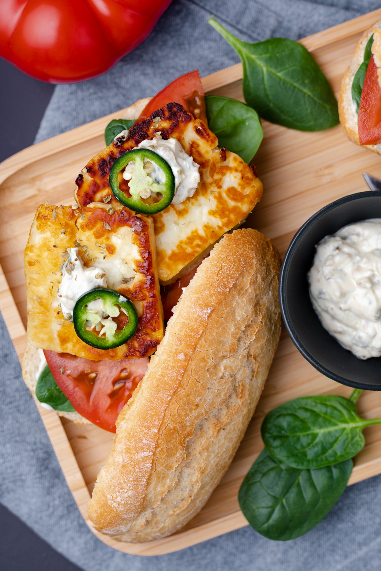 - Snijd de afgebakken pistolets open en besmeer de onderste helft licht met de jalapeño-sjalotspread. Leg daarop wat blaadjes spinazie en plakjes tomaat. Hierop komen 2 plakken van de gebakken halloumi en naar smaak nog wat lepeltjes van de spread. Strooi er als laatste nog wat gedroogde oregano over en daarna kun je lekker lunchen.