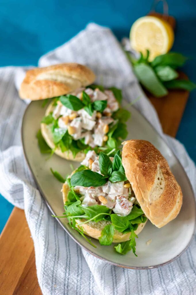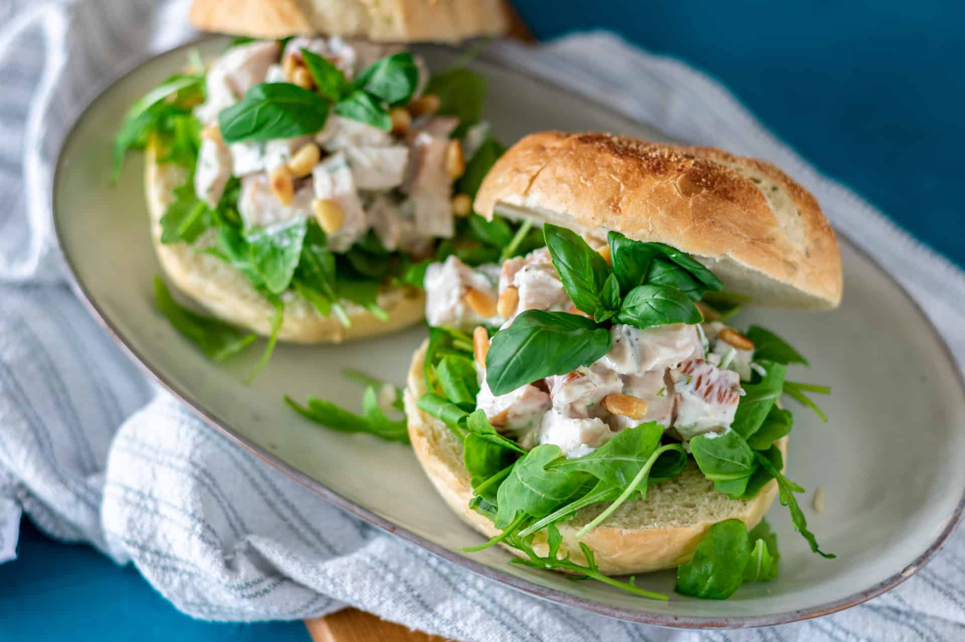 - Beleg je broodjes met rucola of andere sla en de kipsalade. Garneer met pijnboompitjes.