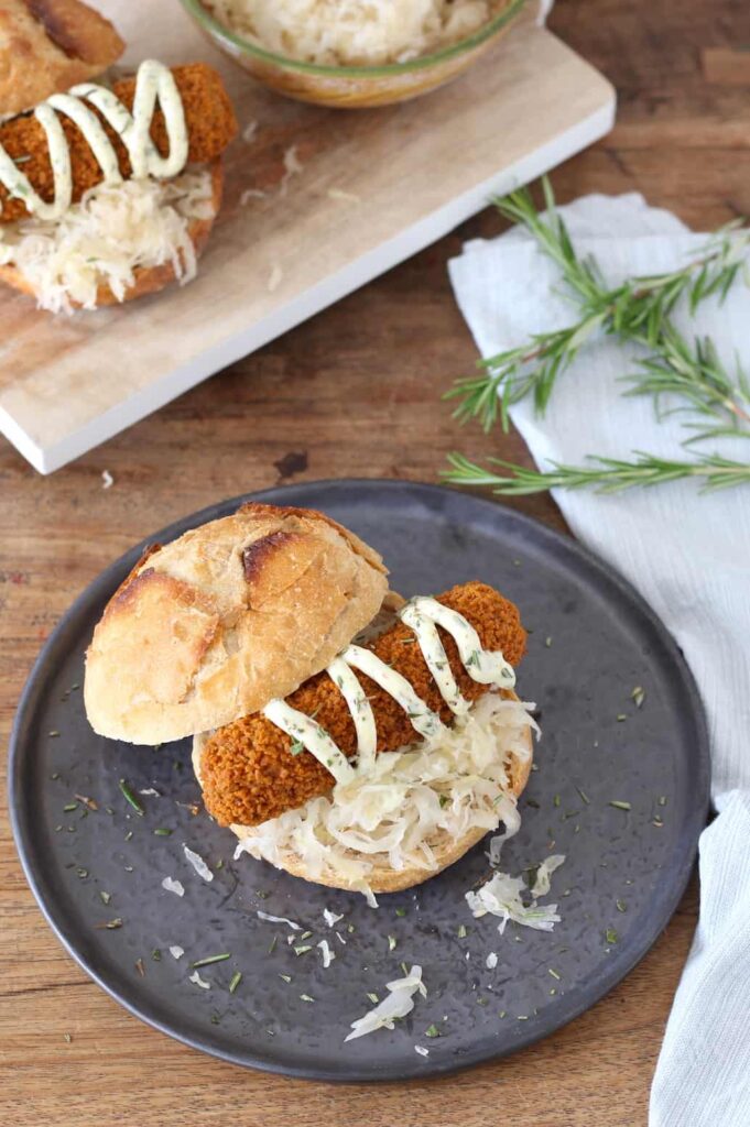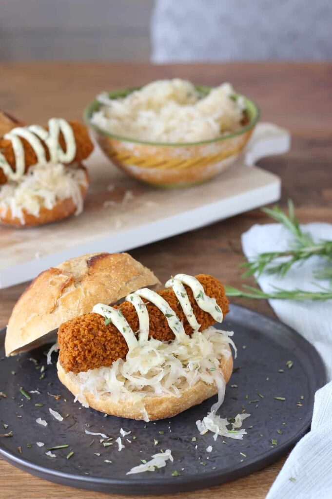 - Snijd de broodjes na het bakken doormidden en besmeer het onderste broodje royaal met roomboter. Beleg met een plukje zuurkool en leg hier de kroket op.