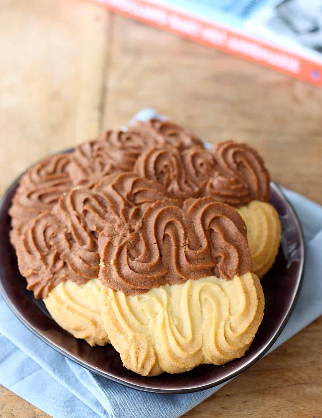 4. Bekleed een bakplaat met bakpapier. Spuit met het vanilledeeg een zigzagbaan van ongeveer 2 cm breed en 6 – 7 cm lang. Houd voldoende afstand tussen de spritsen. Spuit nu het cacaodeeg met dezelfde zigzag-beweging tegen de vanillebanen aan. Tijdens het bakken zullen ze samen één koek worden.