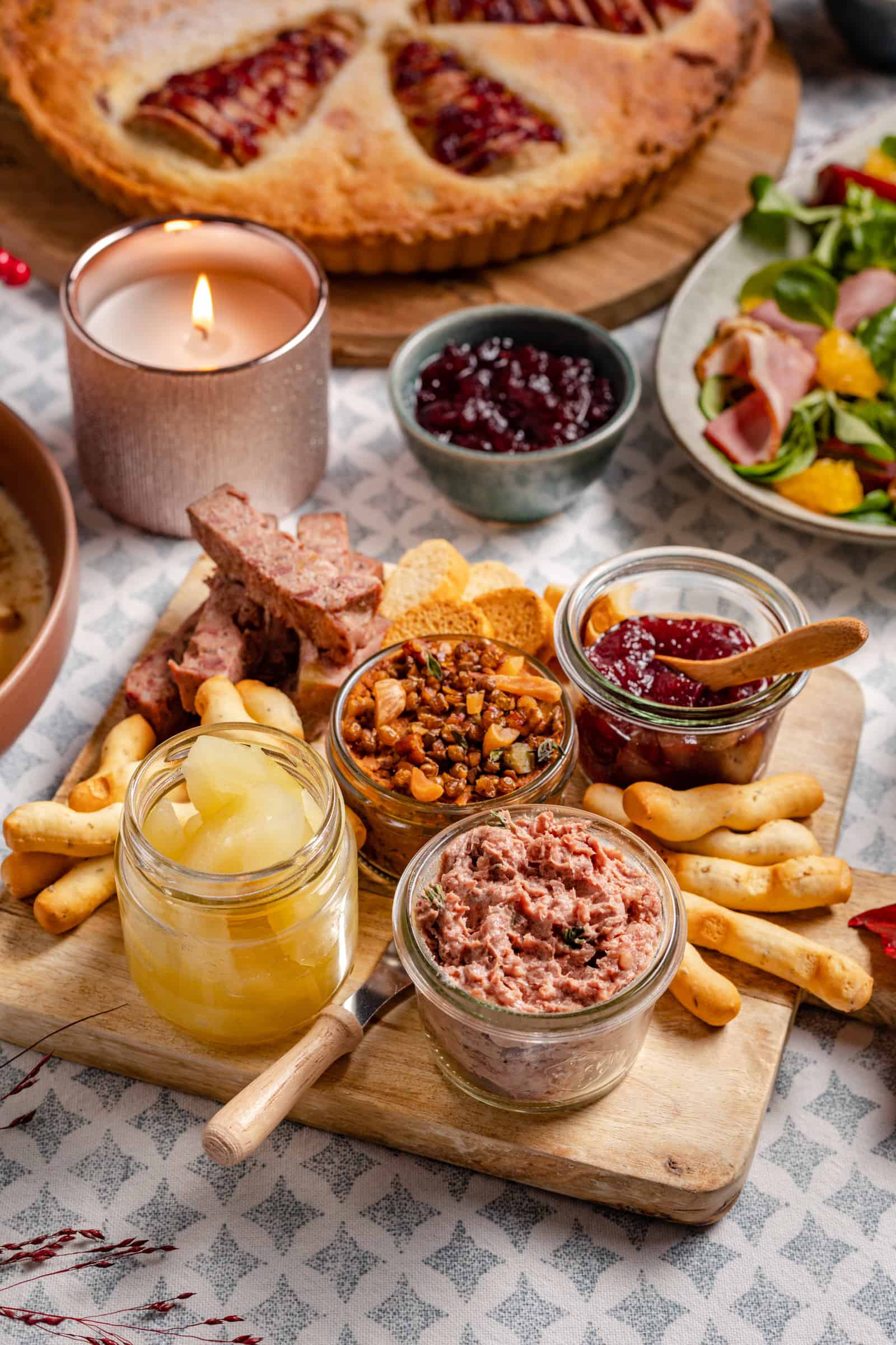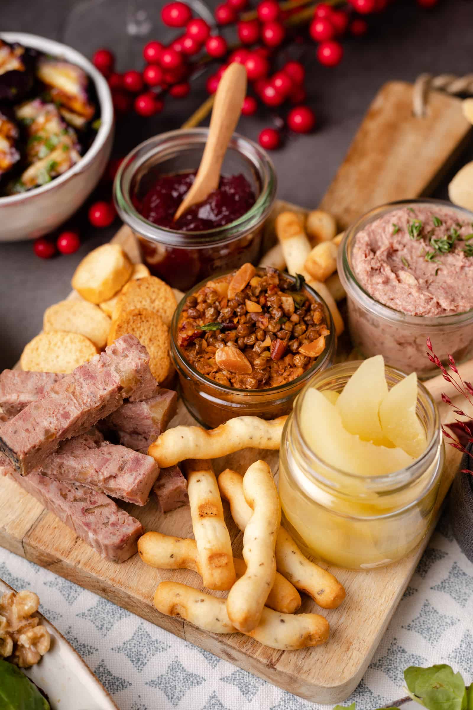 Voor deze patéplank maakte ik een selectie uit de feestelijke patésoorten die PLUS voor de kerstdagen in het assortiment heeft. Zo koos ik voor de paté met wildzwijn en veenbessen en de paté met peer en honing. Maar ze hebben ook nog een ree paté en deze paté met uienconfit. Voor de mensen die vega(n) eten kun je deze vegan paté met pistache serveren.