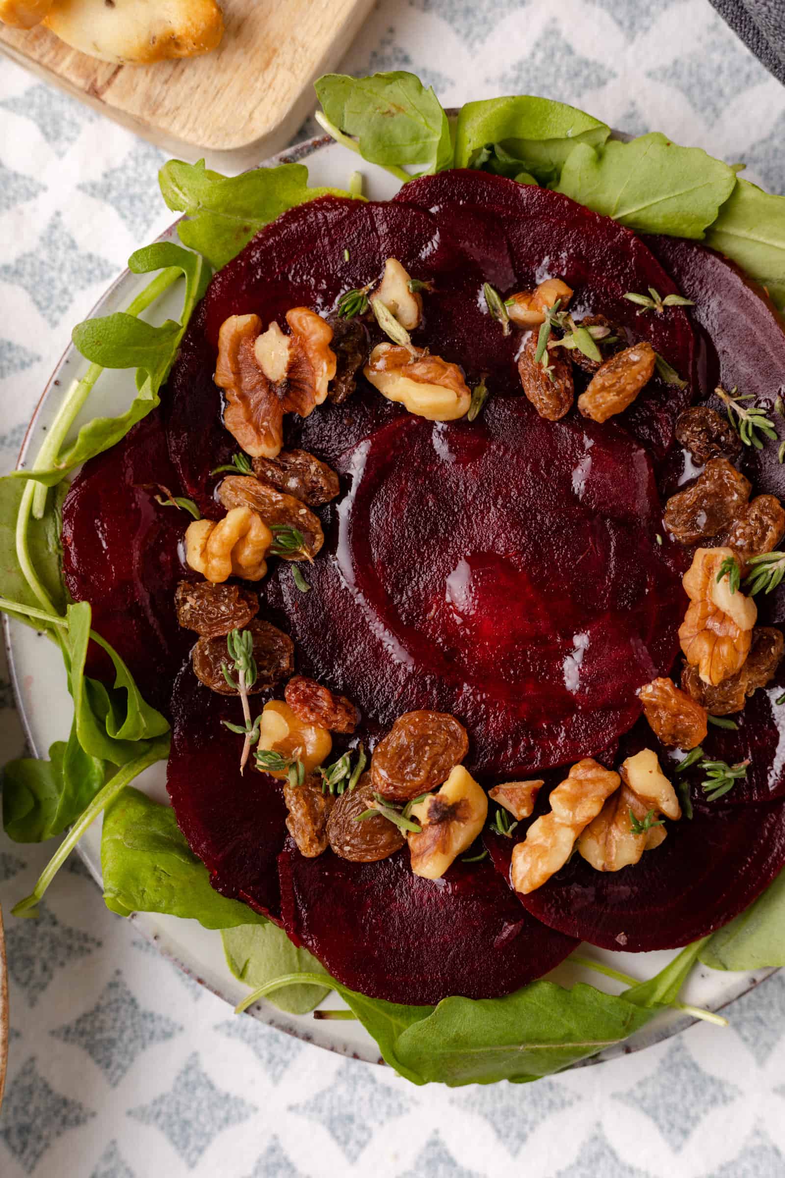 Kun je de bietencarpaccio niet vinden? Koop dan voor de basis gekookte bieten die je in flinterdunne plakjes snijdt. Maak een bordje op met wat gemengde sla en verdeel daarover de plakjes carpaccio. Klop een dressing van 1,5 eetlepel olijfolie extra vergine, ½ eetlepel witte wijnazijn, peper en zout en druppel hier wat van over de carpaccio.