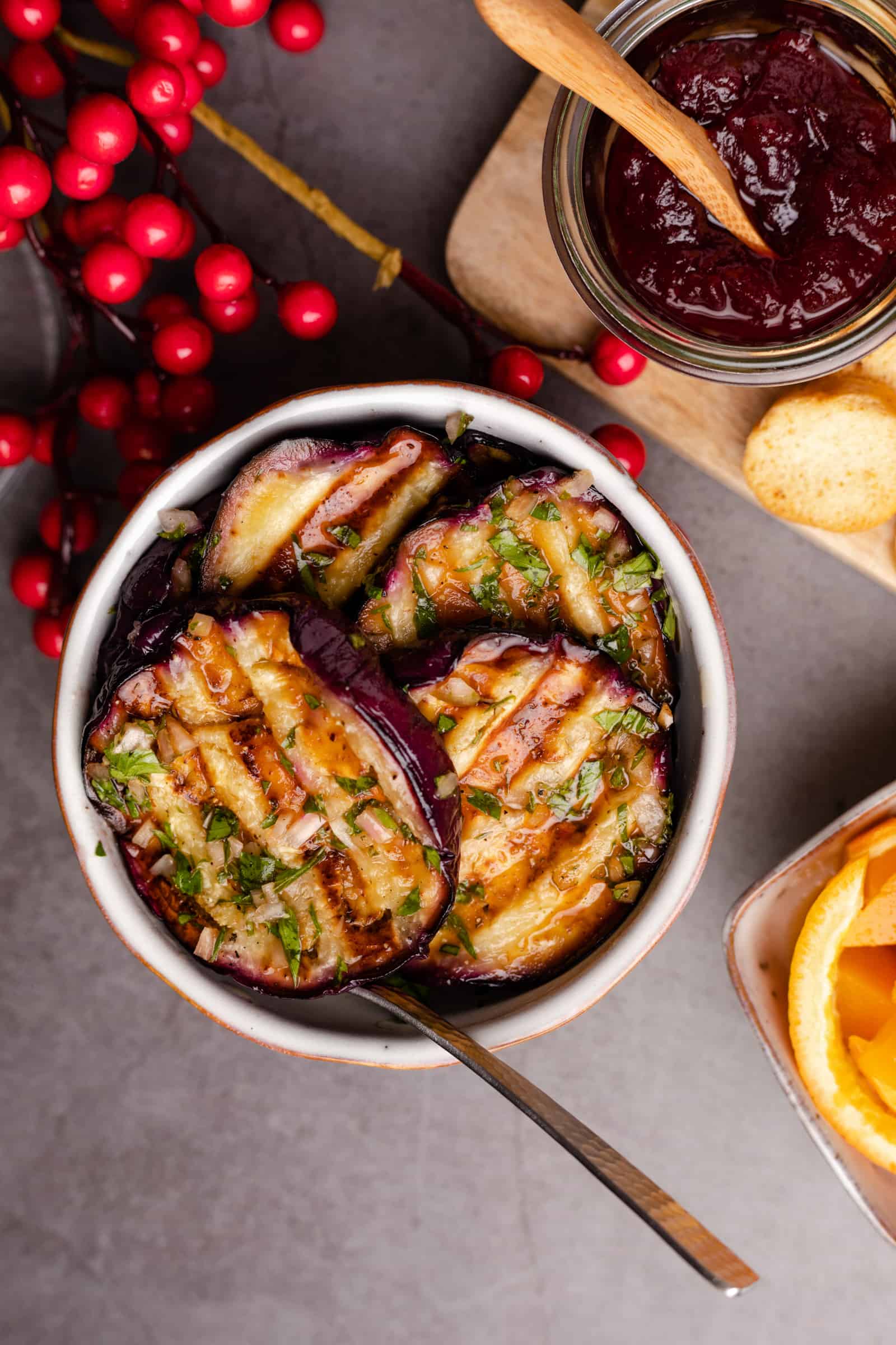 Deze gegrilde aubergine is zo lekker van smaak! En heel makkelijk om voor te bereiden, want je kunt de aubergine al prima een dag eerder grillen en in de sjalot vinaigrette leggen. Daar wordt de smaak alleen maar beter van. Als je toch al aan het grillen bent, kun je met gemak 2 of 3 aubergines verwerken, zodat je gelijk een voorraadje hebt voor meerdere dagen.