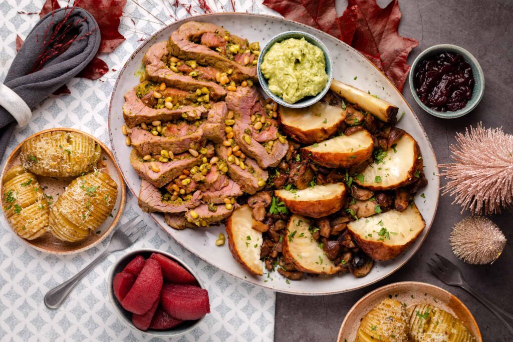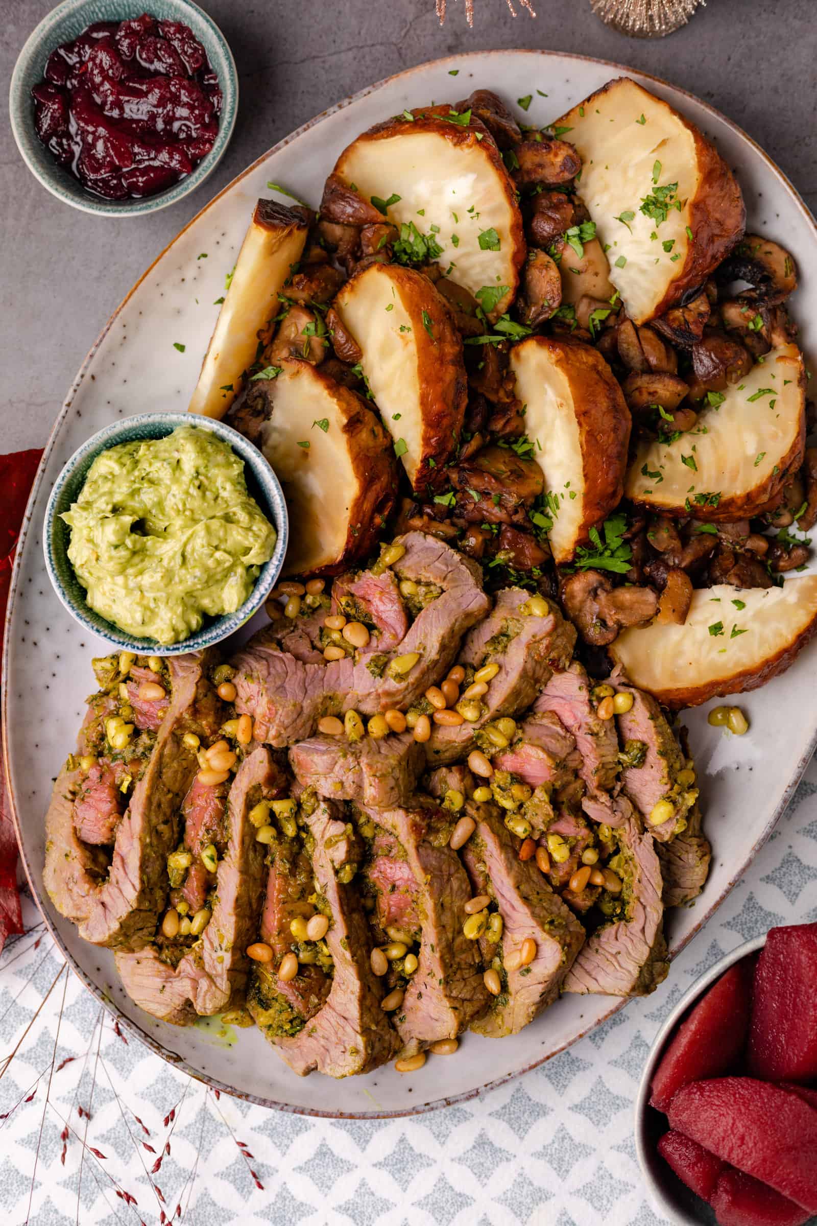 Ik serveerde er een luchtige pestoboter bij. Meng hiervoor 125 gram ongezouten boter (op kamertemperatuur) met 2 eetlepels verse pesto. Klop dit een paar minuten op tot een luchtige boter met een handmixer. Voeg vervolgens zeezout flakes toe naar smaak. Serveer dit op kamertemperatuur in een bakje bij het vlees.